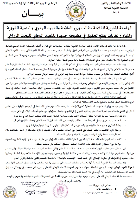 وأكدت الجامعة المغربية للفلاحة أنها لن تتاجر بملفات الفساد التي تتوصل بها ولن تقايض بها كما يفعل البعض، داعية فإنها شغيلة المعهد الوطني للبحث الزراعي للالتفاف حول المنظمة العتيدة الاتحاد الوطني للشغل بالمغرب التي ستقف في وجه كل مسؤول فاسد وكل متسلط على الشغيلة من أي موقع كان ومهما كلفها ذلك من تضحيات.