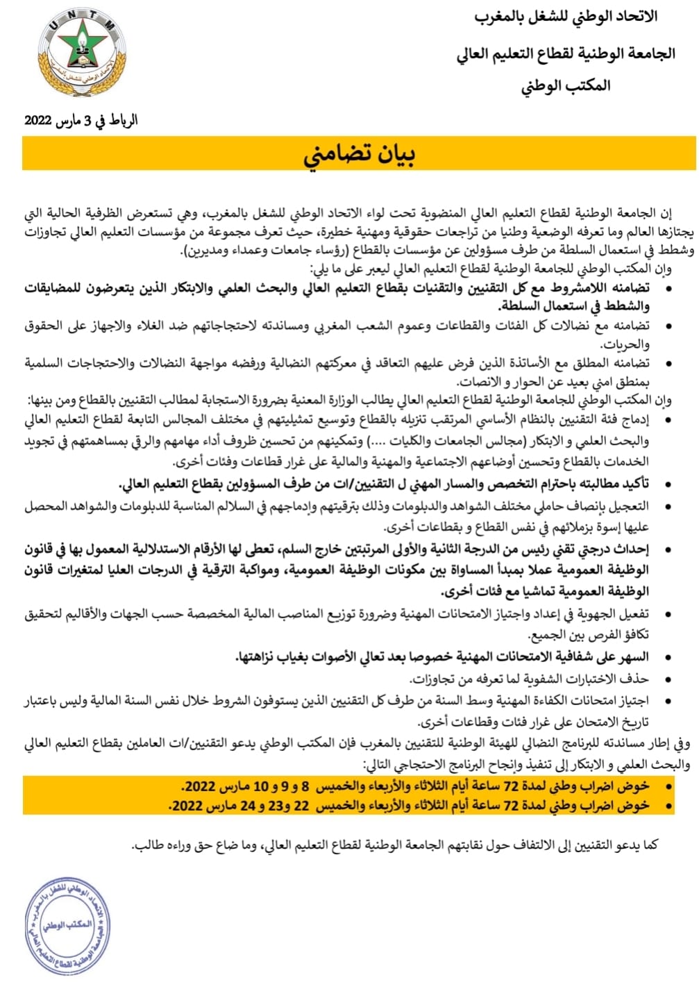 ودعت الجامعة، التقنيين/ات العاملين بقطاع التعليم العالي والبحث العلمي و الابتكار إلى تنفيذ وإنجاح البرنامج الاحتجاجي، بخوض اضراب وطني لمدة 72 ساعة أيام الثلاثاء والأربعاء والخميس 8 و 9 و 10 مـــارس 2022، واضراب وطني لمدة 72 ساعة أيام الثلاثاء والأربعاء والخميس 22 و23 و 24 مـــارس 2022.