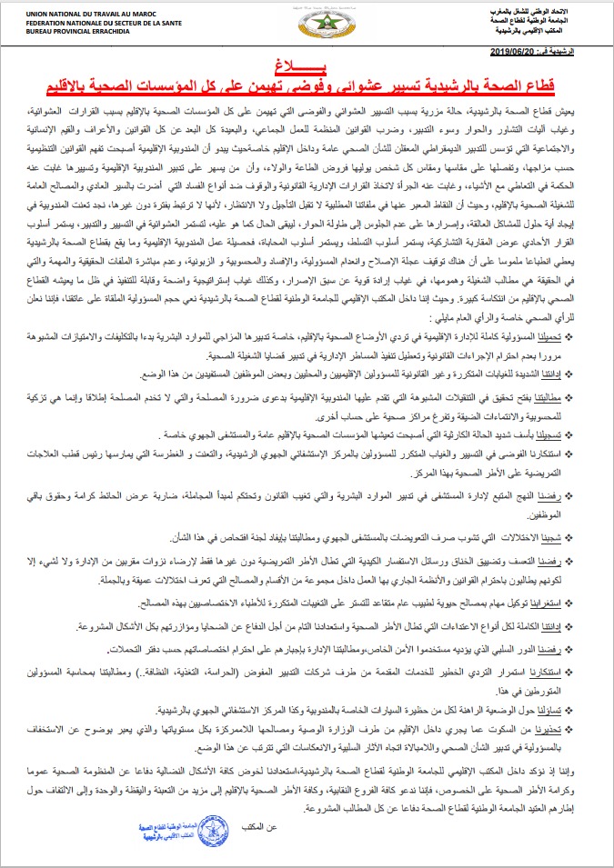 وسجل المكتب بأسف شديد الحالة الكارثية التي أصبحت تعيشها المؤسسات الصحية بالإقليم عامة والمستشفى الجهوي خاصة، مستنكرا الفوضى في التسيير والغياب المكترر للمسؤولين بالمركز الاستشفائي الجهوي الرشيدية، والتعنت الذي يمارسه رئيس قطب العلاجات التمريضية على الأطر الصحية بهذا المركز.