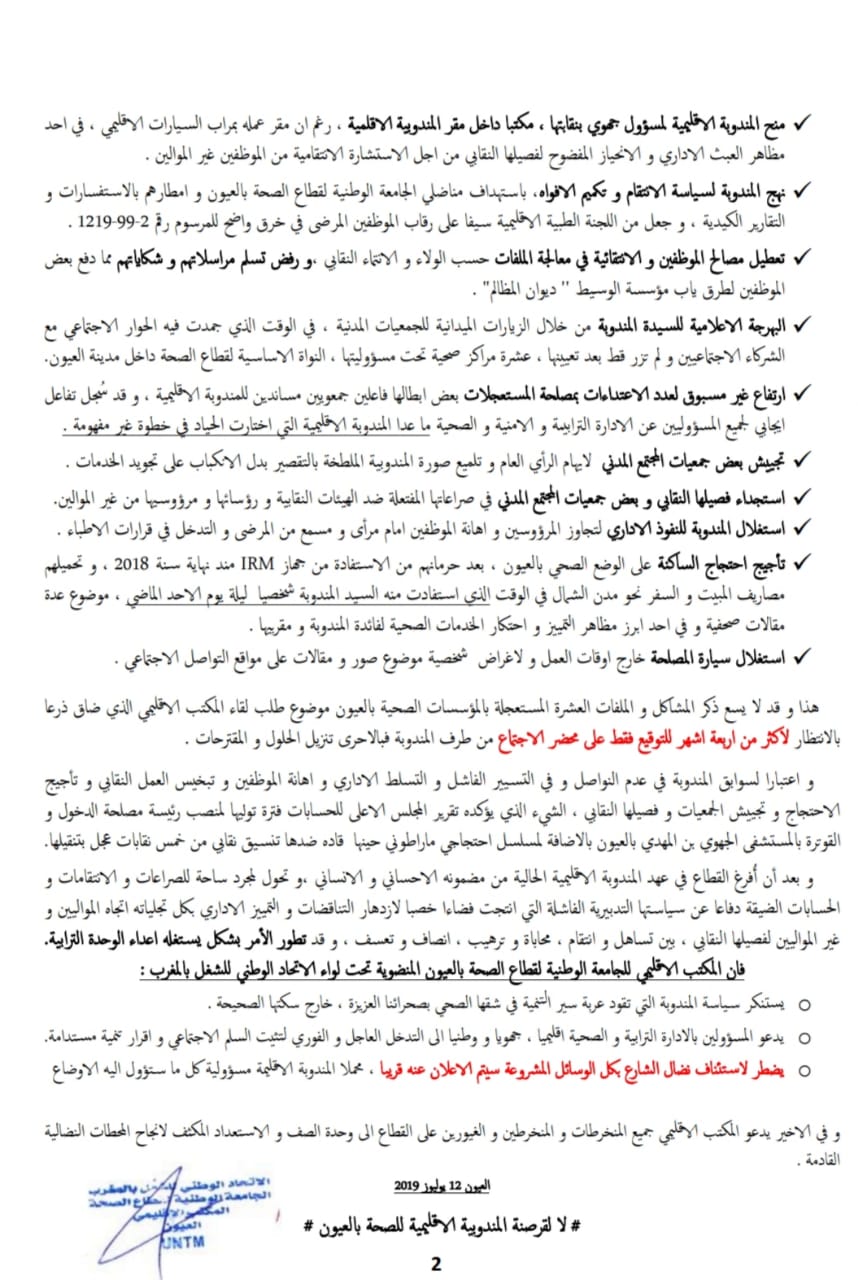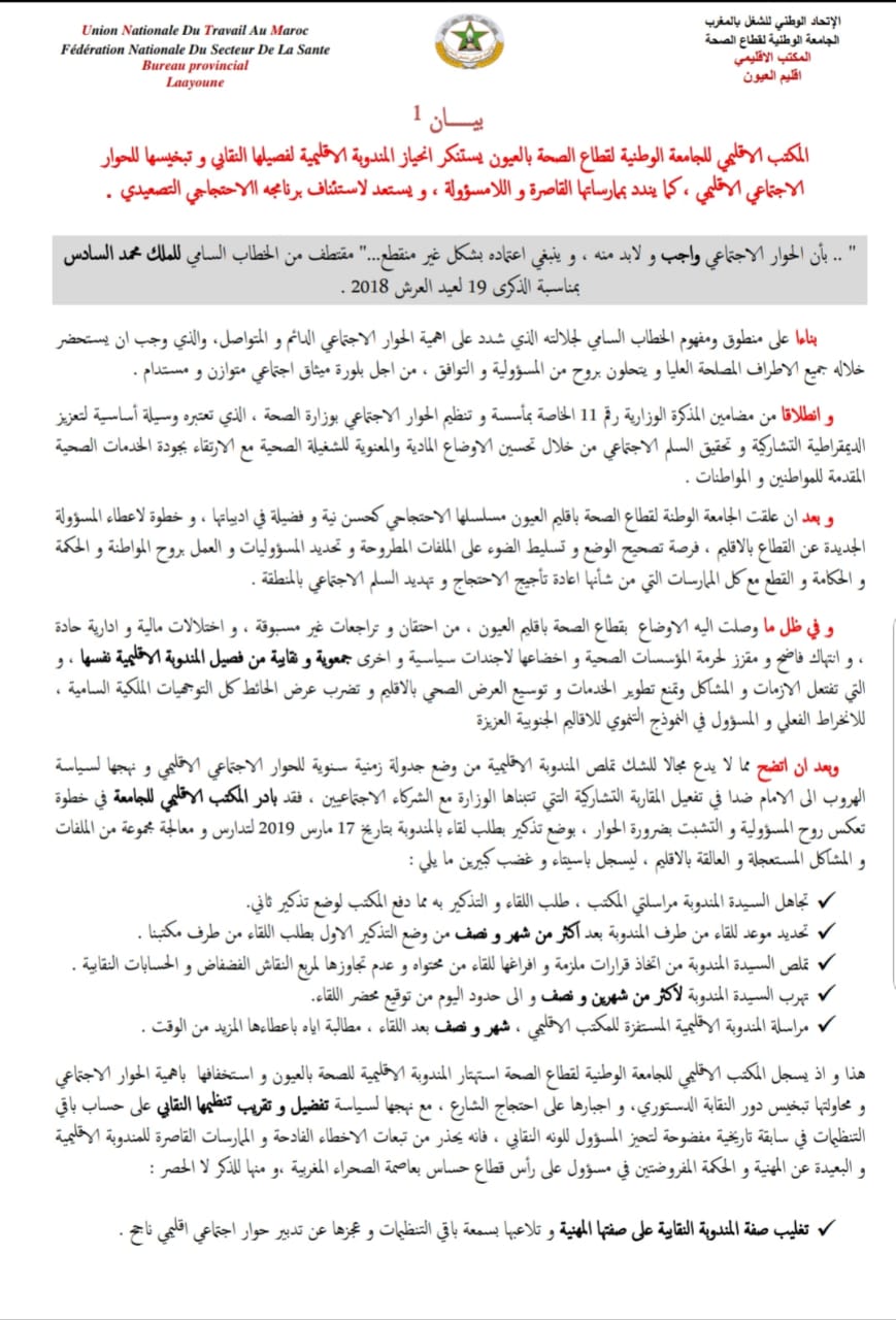 وسجل المكتب الاقليمي للجامعة الوطنية لقطاع الصحة استهتار المندوبة الاقليمية للصحة بالعيون واستخفافها بأهمية الحوار الاجتماعي ومحاولتها تبخيس دور النقابة الدستوري، واجبارها على احتجاج الشارع، مع نهجها لسياسة تفضيل وتقريب تنظيمها النقابي على حساب باقي التنظيمات في سابقة تاريخية مفضوحة لتحيز المسؤول للونه النقابي، محذرا من تبعات الاخطاء الفادحة والبعيدة عن المهنية والحكمة المفروضتين في مسؤول على رأس قطاع حساس بعاصمة الصحراء المغربية.