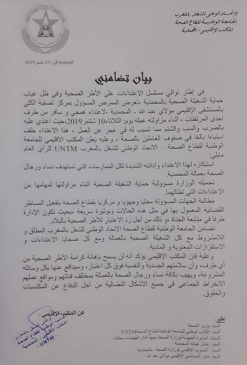 وطالب المكتب الجهات المسؤولة محليا وجهويا و مركزيا بقطاع الصحة بتفعيل المساطر القضائية المعمول بها في مثل هذه الحالات وبوتيرة سريعة ، بحيث تكون الإدارة طرفا في متابعة الجناة ، و ذلك من أجل رد الاعتبار للأطر الصحية بالبلاد، مؤكدا تضامن الجامعة الوطنية لقطاع الصحة الاتحاد الوطني للشغل بالمغرب المطلق واللامشروط مع كل الشغيلة الصحية بالعمالة ومع كل ضحايا الاعتداءات والاستفزازات المعنوية و المادية.