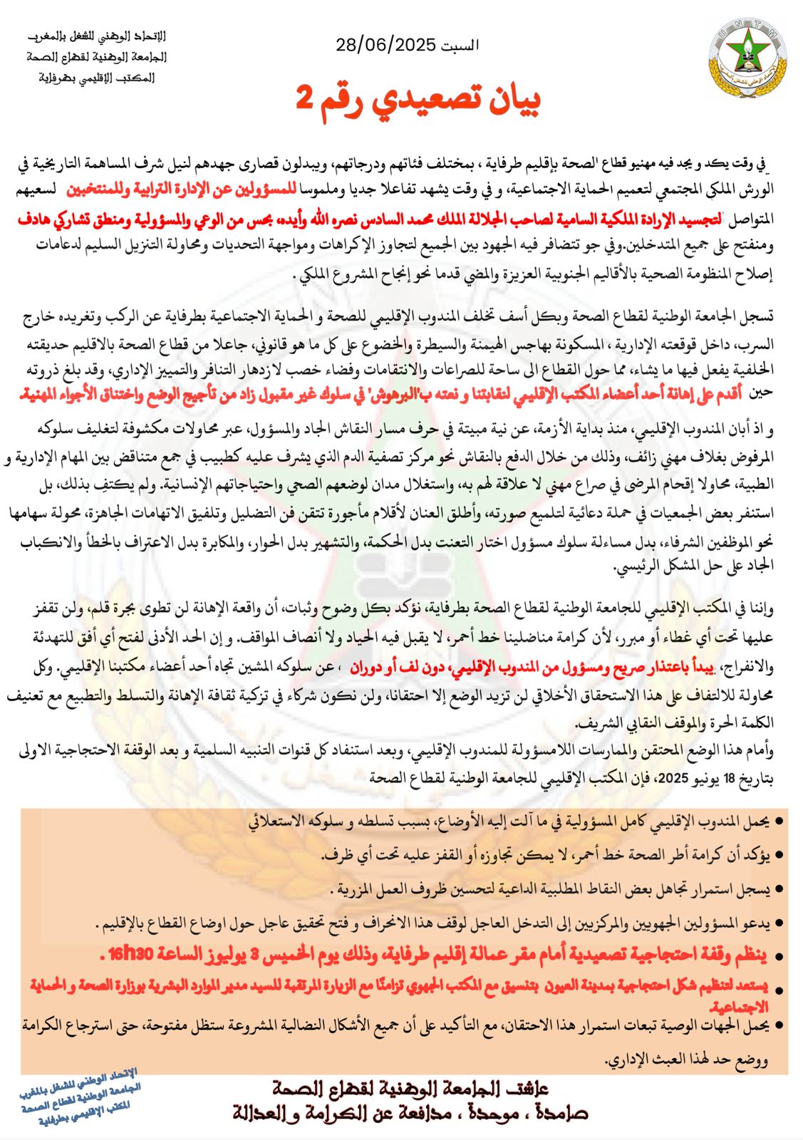 وفي خطوة تصعيدية، أعلن المكتب الإقليمي عن تنظيم وقفة احتجاجية يوم الخميس 3 يوليوز 2025 على الساعة 16:30 أمام عمالة طرفاية، كما لوّح بتحركات ميدانية بمدينة العيون بالتنسيق مع المكتب الجهوي، تزامنًا مع زيارة مرتقبة لمسؤول مركزي بوزارة الصحة.