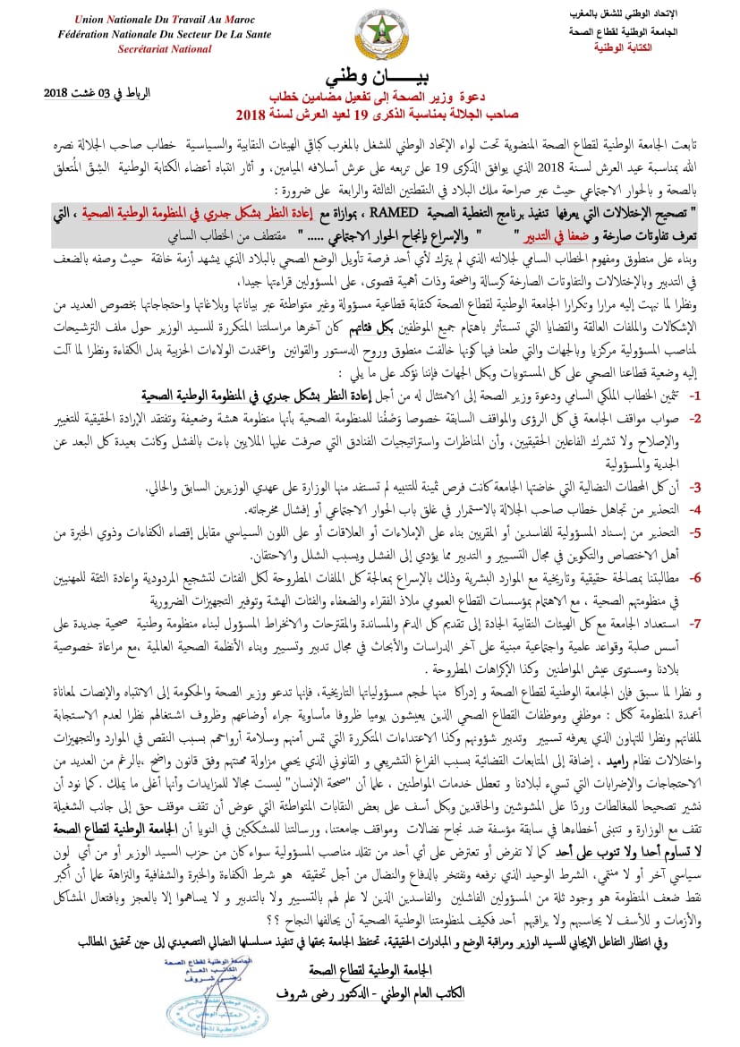 وحذرت الجامعة من إسناد المسؤولية للفاسدين أو المقربين بناء على الإملاءات أو العلاقات أو على اللون السياسي مقابل إقصاء الكفاءات وذوي الخبرة من أهل الاختصاص والتكوين في مجال التسيير و التدبير مما يؤدي إلى الفشل ويسبب الشلل والاحتقان، داعية إلى مصالحة حقيقية وتاريخية مع الموارد البشرية وذلك بالإسراع بمعالجة كل الملفات المطروحة لكل الفئات لتشجيع المردودية وإعادة الثقة للمهنيين في منظومتهم الصحية ، مع الاهتمام بمؤسسات القطاع العمومي ملاذ الفقراء والضعفاء والفئات الهشة وتوفير التجهيزات الضرورية.