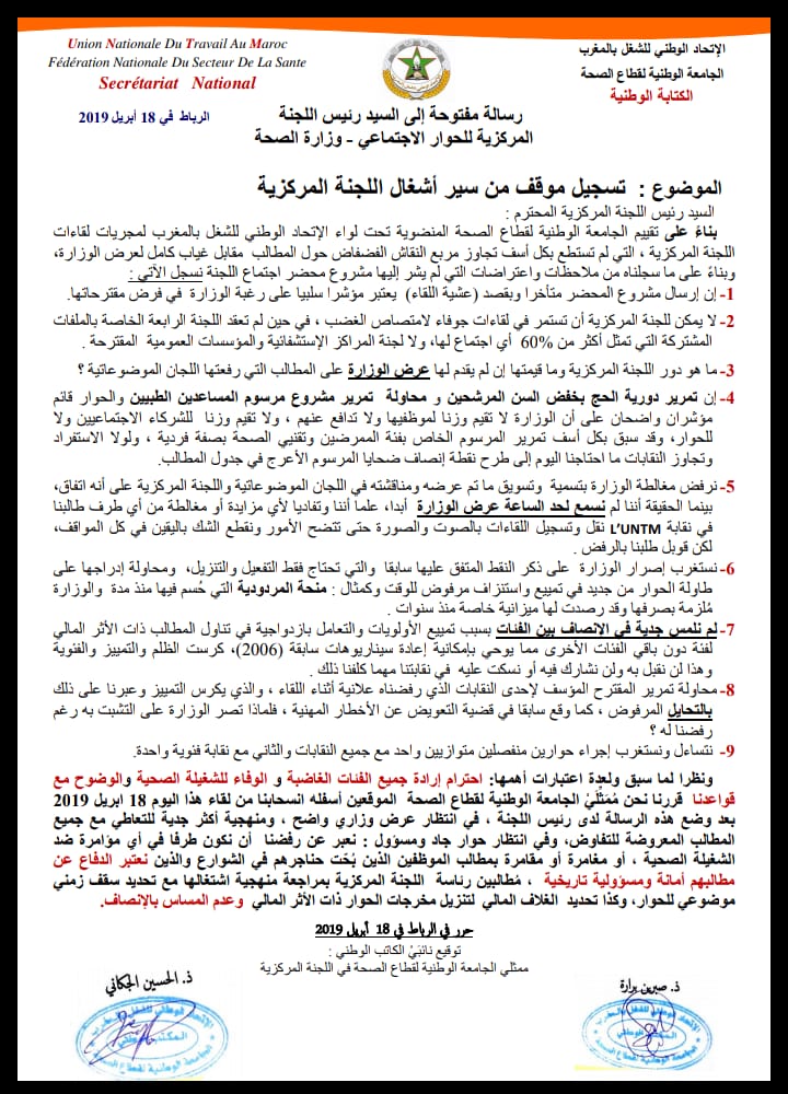 قررت الجامعة الوطنية لقطاع الصحة المنضوية تحت لواء الاتحاد الوطني للشغل بالمغرب، من خلال ممثليها الانسحاب من لقاء اللجنة المركزية للحوار، ليوم الخميس 18 أبريل 2019، في انتظار عرض وزاري واضح ، ومنهجية أكثر جدية للتعاطي مع جميع المطالب المعروضة للتفاوض، وحوار جاد ومسؤول.