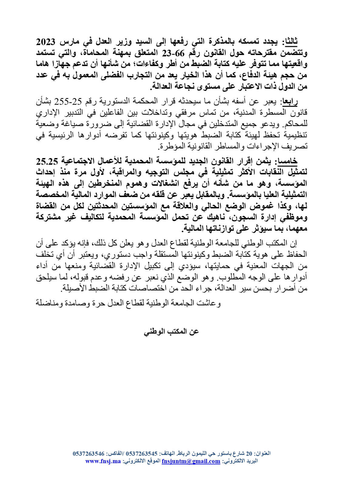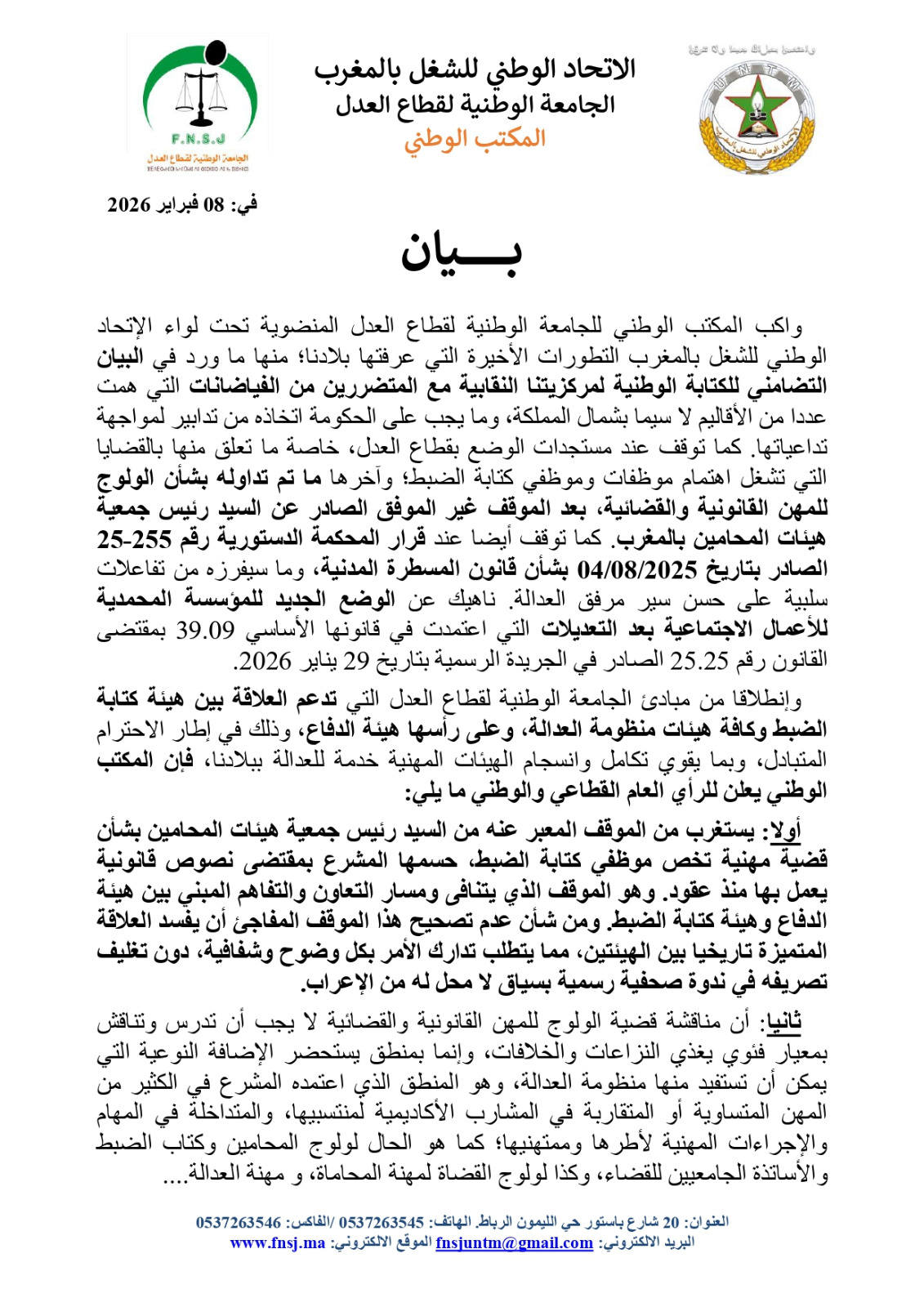 وشدد المكتب الوطني للجامعة الوطنية لقطاع العدل، على الحفاظ على هوية كتابة الضبط وكينونتها المستقلة واجب دستوري، معتبرا أن أي تخلف من الجهات المعنية في حمايتها، سيؤدي إلى تكبيل الإدارة القضائية ومنعها من أداء أدوارها على الوجه المطلوب. وهو الوضع الذي نعبر عن رفضه وعدم قبوله، لما سيلحق من أضرار بحسن سير العدالة، جراء الحد من اختصاصات كتابة الضبط الأصيلة.