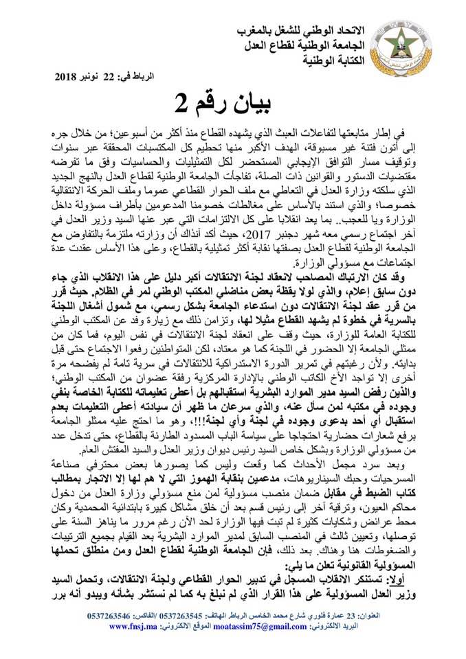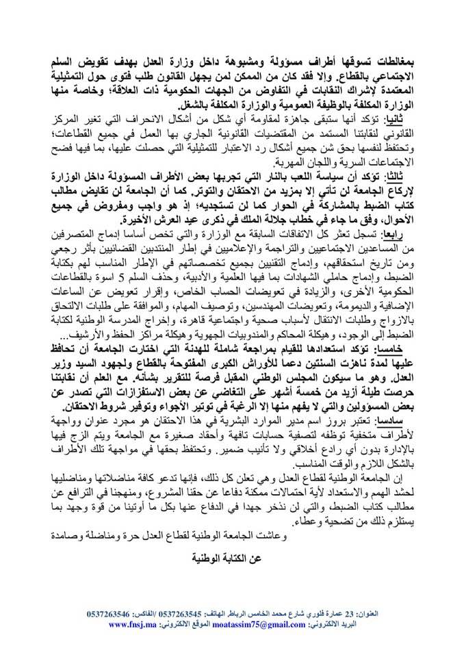وقالت الجامعة إن سياسة اللعب بالنار التي تجربها بعض الأطراف المسؤولة داخل الوزارة لإركاعها لن تأتي إلا بمزيد من الاحتقان والتوتر، مضيفة أنها لن تقايض مطالب كتاب الضبط بالمشاركة في الحوار كما لن تستجديه؛ إذ هو واجب ومفروض في جميع الأحوال، وفق ما جاء في خطاب جلالة الملك في ذكرى عيد العرش الأخيرة.