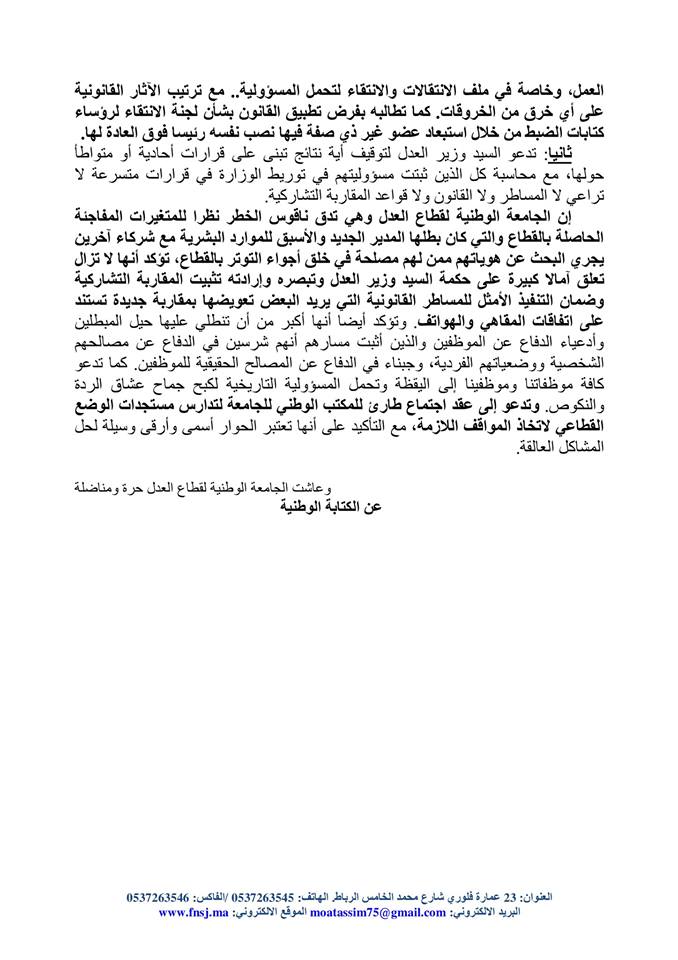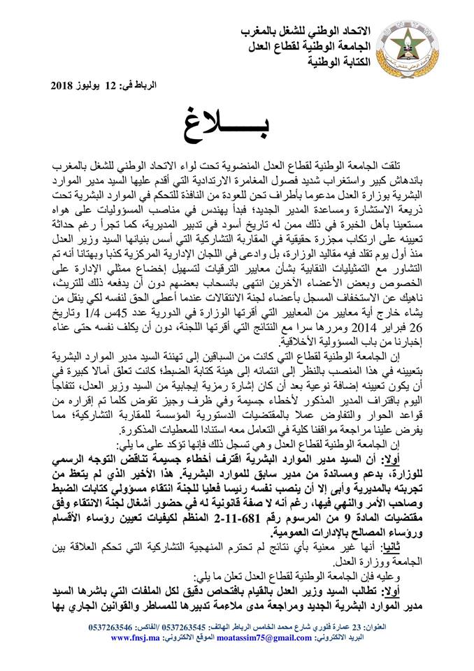 وأكدت الجامعة أن مدير الموارد البشرية اقترف أخطاء جسيمة تناقض التوجه الرسمي للوزارة، بدعم ومساندة من مدير سابق للموارد البشرية، مشيرة إلى أنها غير معنية بأي نتائج لم تحترم المنهجية التشاركية التي تحكم العلاقة بين الجامعة ووزارة العدل.