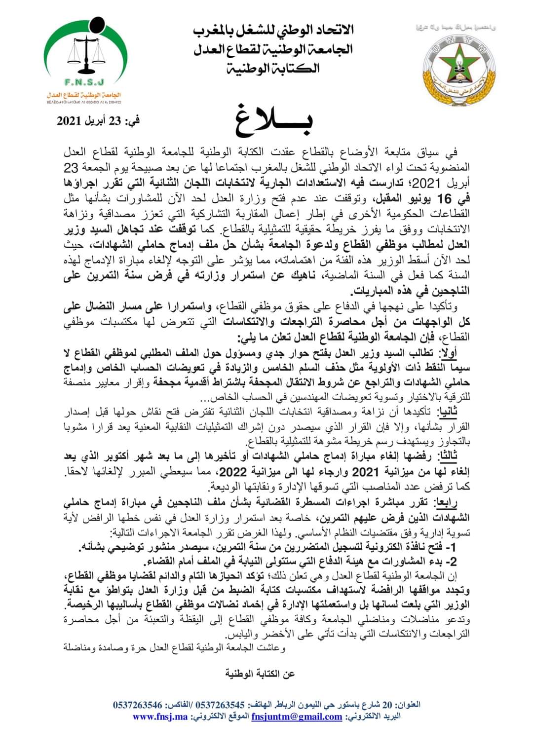 وأعلنت رفضها إلغاء مباراة إدماج حاملي الشهادات أو تأخيرها إلى ما بعد شهر أكتوبر الذي يعد إلغاء لها من ميزانية 2021 وارجاء لها الى ميزانية 2022، مما سيعطي المبرر لإلغائها لاحقا. كما ترفض عدد المناصب التي تسوقها الإدارة ونقابتها الوديعة.