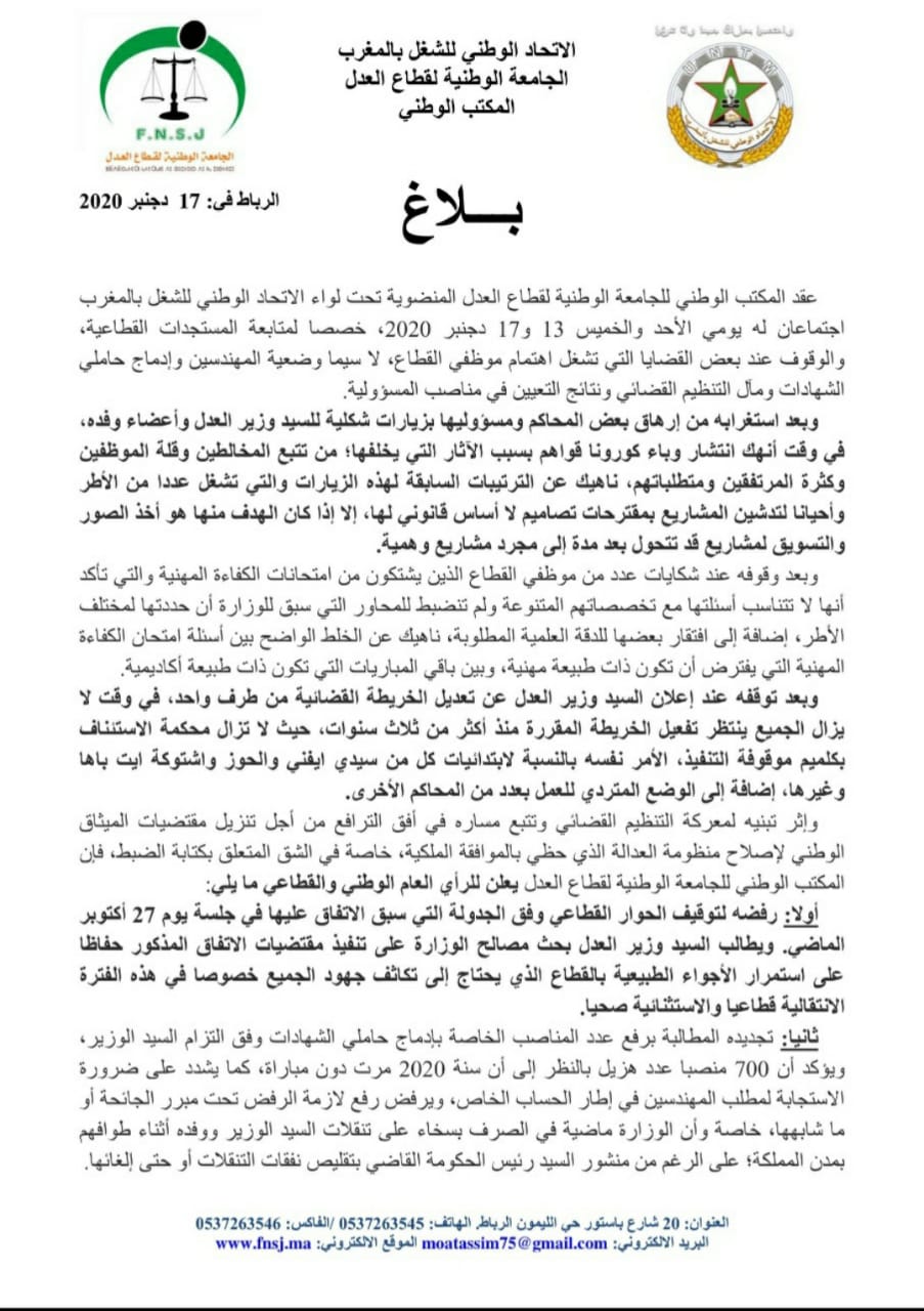 وطالبت الجامعة، في بلاغ لها خلال الاجتماعان الذان عقدهما مكتبها الوطني يومي الأحد والخميس 13 و17 دجنبر 2020، خصصا لمتابعة المستجدات القطاعية، (طالبت) وزير العدل بحث مصالح الوزارة على تنفيذ مقتضيات الاتفاق المذكور حفاظا على استمرار الأجواء الطبيعية بالقطاع الذي يحتاج إلى تكاثف جهود الجميع خصوصا في هذه الفترة الانتقالية قطاعيا والاستثنائية صحيا.