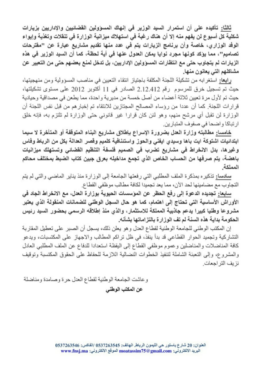 وأكدت الجامعة على أن استمرار الوزير في إنهاك المسؤولين القضائيين والإداريين بزيارات شكلية كل أسبوع لن يفهم منه إلا أن هناك رغبة في استهلاك ميزانية الوزارة في تنقلات وتغذية وإيواء الوفد الوزاري، خاصة وأن برنامج الزيارات يتم في عدد منها تقديم مشاريع عبارة عن “مقترحات تصاميم”، مما يؤكد كونها مجرد نوايا يمكن العدول عنها في أية لحظة، كما أن السيد الوزير في هذه الزيارات لم يتجاوب حتى مع انتظارات المسؤولين الإداريين، بل تدخل لمنع بعضهم حتى من التعبير عن مشاكلهم التي يعانون منها.