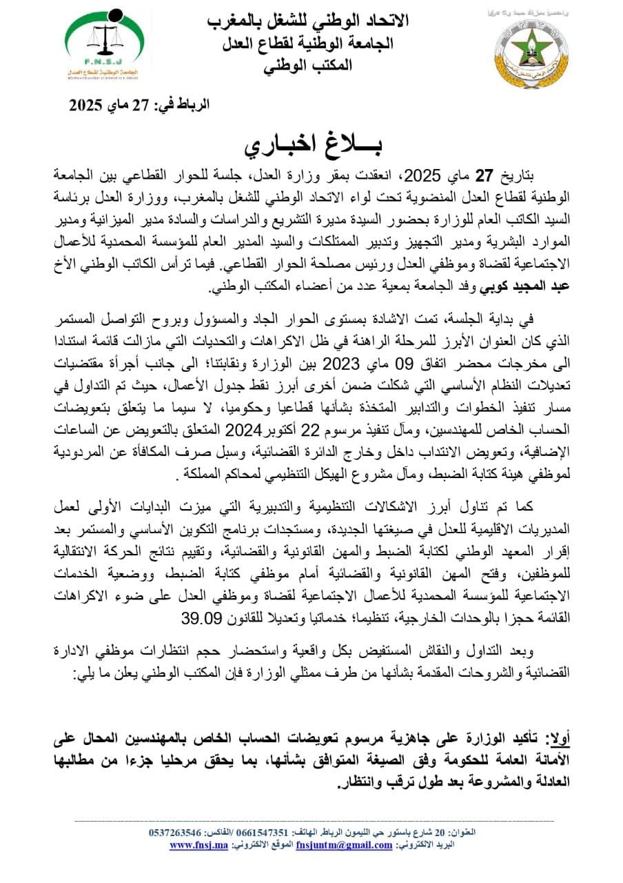 الجامعة الوطنية لقطاع العدل تكشف عن مخرجات جلسة الحوار القطاعي مع الوزارة