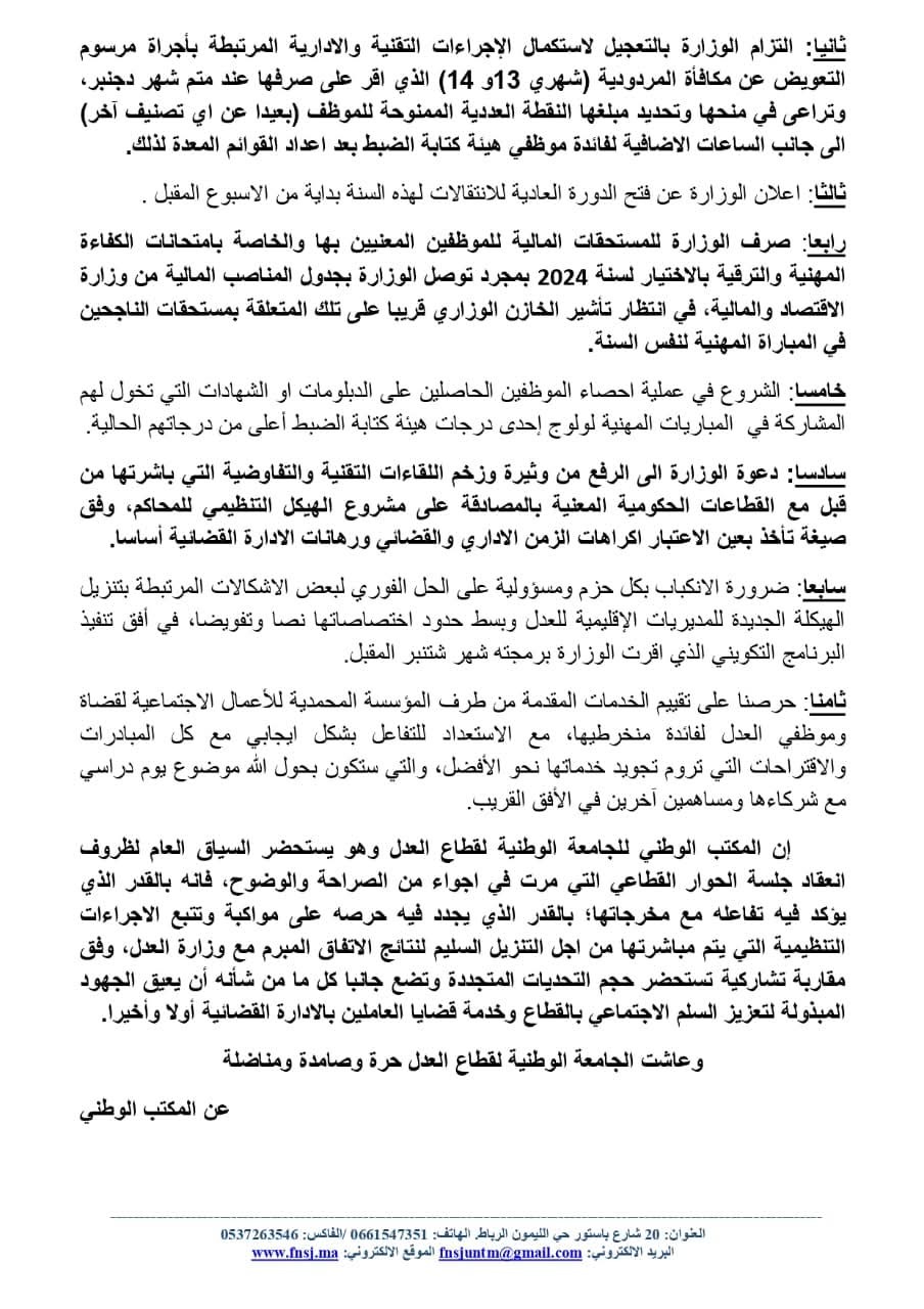 وقال المكتب الوطني للجامعة، انه بالقدر الذي يؤكد فيه تفاعله مع مخرجات جلسة الحوار القطاعي؛ بالقدر الذي يجدد فيه حرصه على مواكبة وتتبع الاجراءات التنظيمية التي يتم مباشرتها من اجل التنزيل السليم لنتائج الاتفاق المبرم مع وزارة العدل، وفق مقاربة تشاركية تستحضر حجم التحديات المتجددة وتضع جانبا كل ما من شأنه أن يعيق الجهود المبذولة لتعزيز السلم الاجتماعي بالقطاع وخدمة قضايا العاملين بالادارة القضائية أولا وأخيرا.
