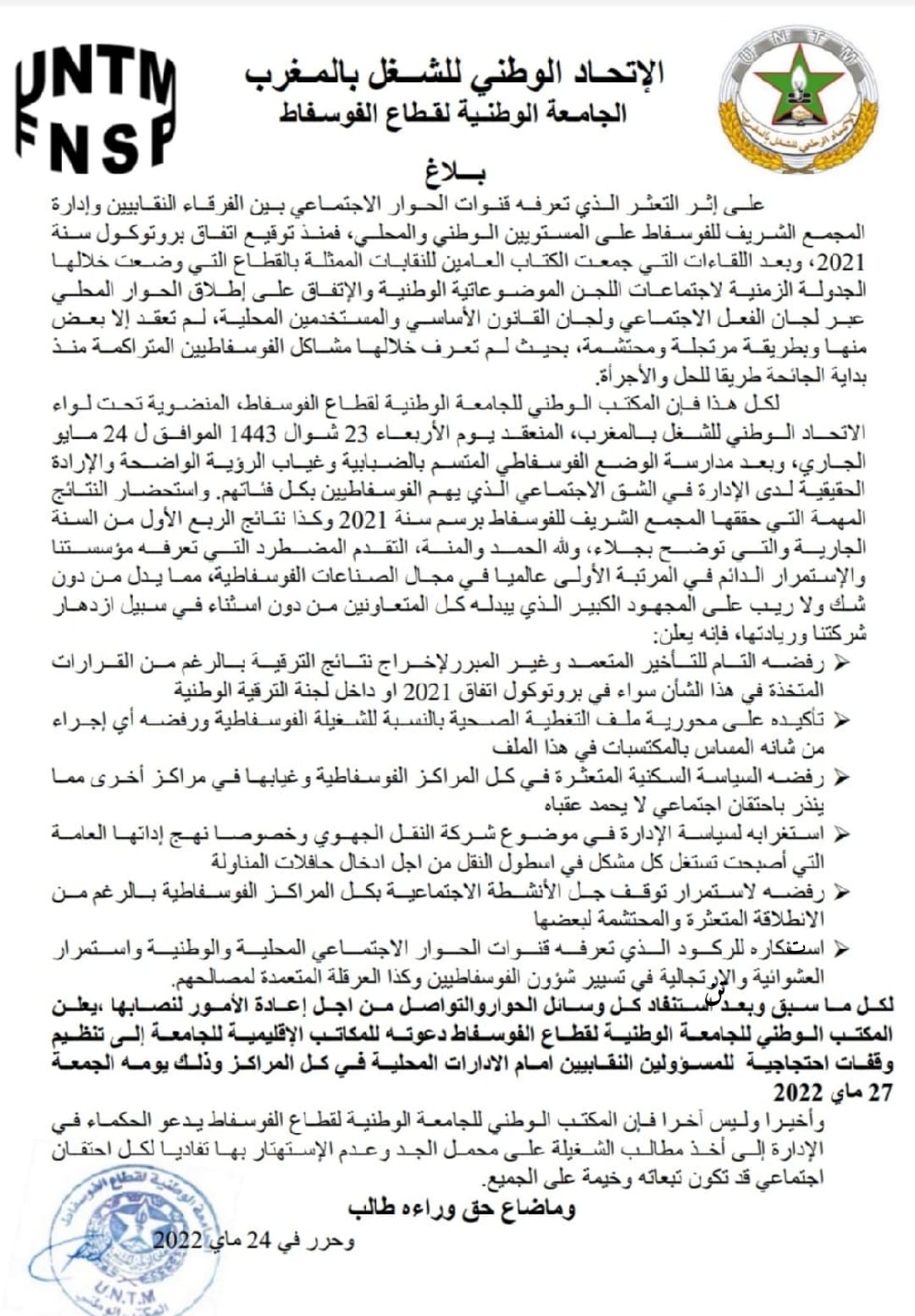 وأعلنت الجامعة الوطنية لقطاع الفوسفاط، رفضها التام للتأخير المتعمد وغير المبرر لإخراج نتائج الترقية بالرغم من القرارات المتخذة في هذا الشأن سواء في بروتوكول اتفاق 2021 او داخل لجنة الترقية الوطنية.