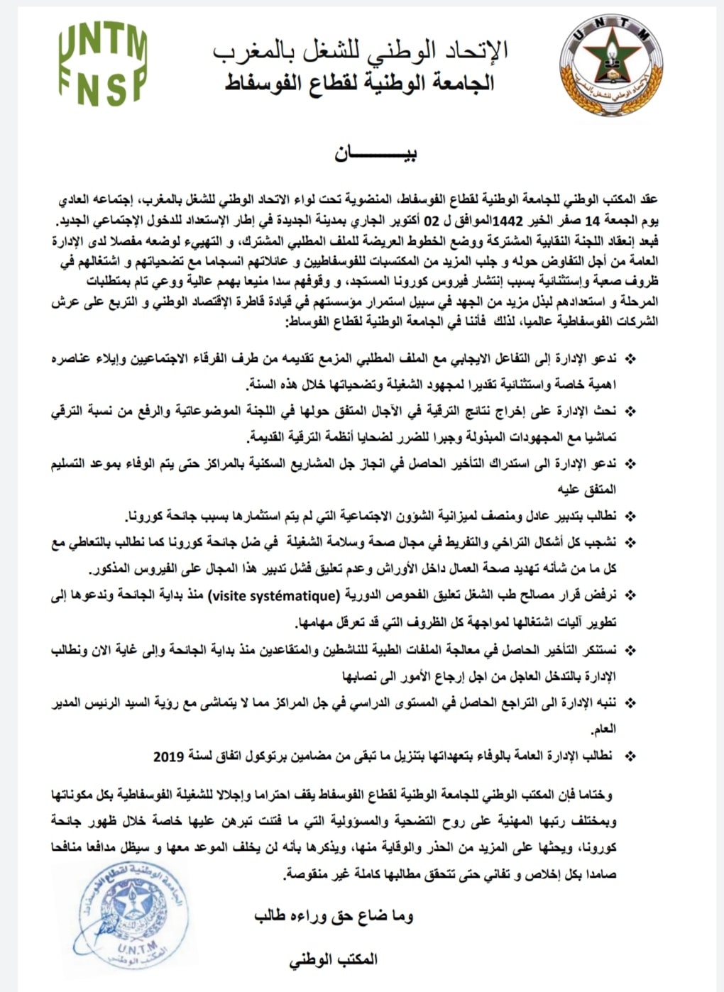 وطالبت الإدارة العامة بالوفاء بتعهداتها بتنزيل ما تبقى من مضامين برتوكول اتفاق لسنة 2019، وأشادت بالشغيلة الفوسفاطية بكل مكوناتها وبمختلف رتبها المهنية على روح التضحية والمسؤولية التي ما فتئت تبرهن عليها خاصة خلال ظهور جائحة كورونا، داعية إلى المزيد من الحذر والوقاية منها.