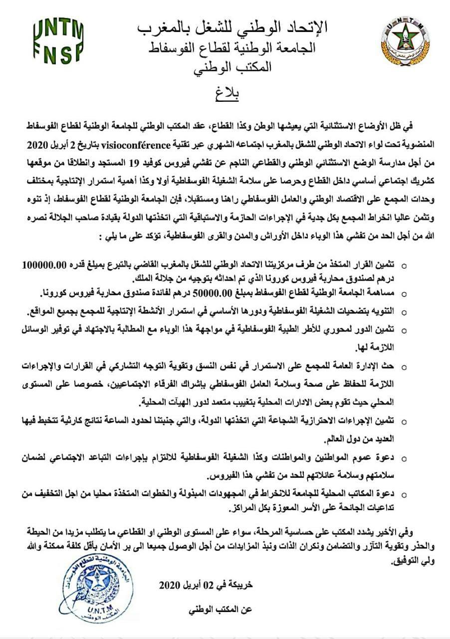 في ظل الأوضاع الاستثنائية التي يعيشها الوطن وكذا قطاع الفوسفاط، عقد المكتب الوطني للجامعة الوطنية لقطاع الفوسفاط المنضوية تحت لواء الاتحاد الوطني للشغل بالمغرب اجتماعه الشهري عبر تقنية visioconférence الخميس 2 أبريل 2020 من أجل مدارسة الوضع الاستثنائي الوطني والقطاعي الناجم عن تفشي فيروس كوفيد 19 المستجد.