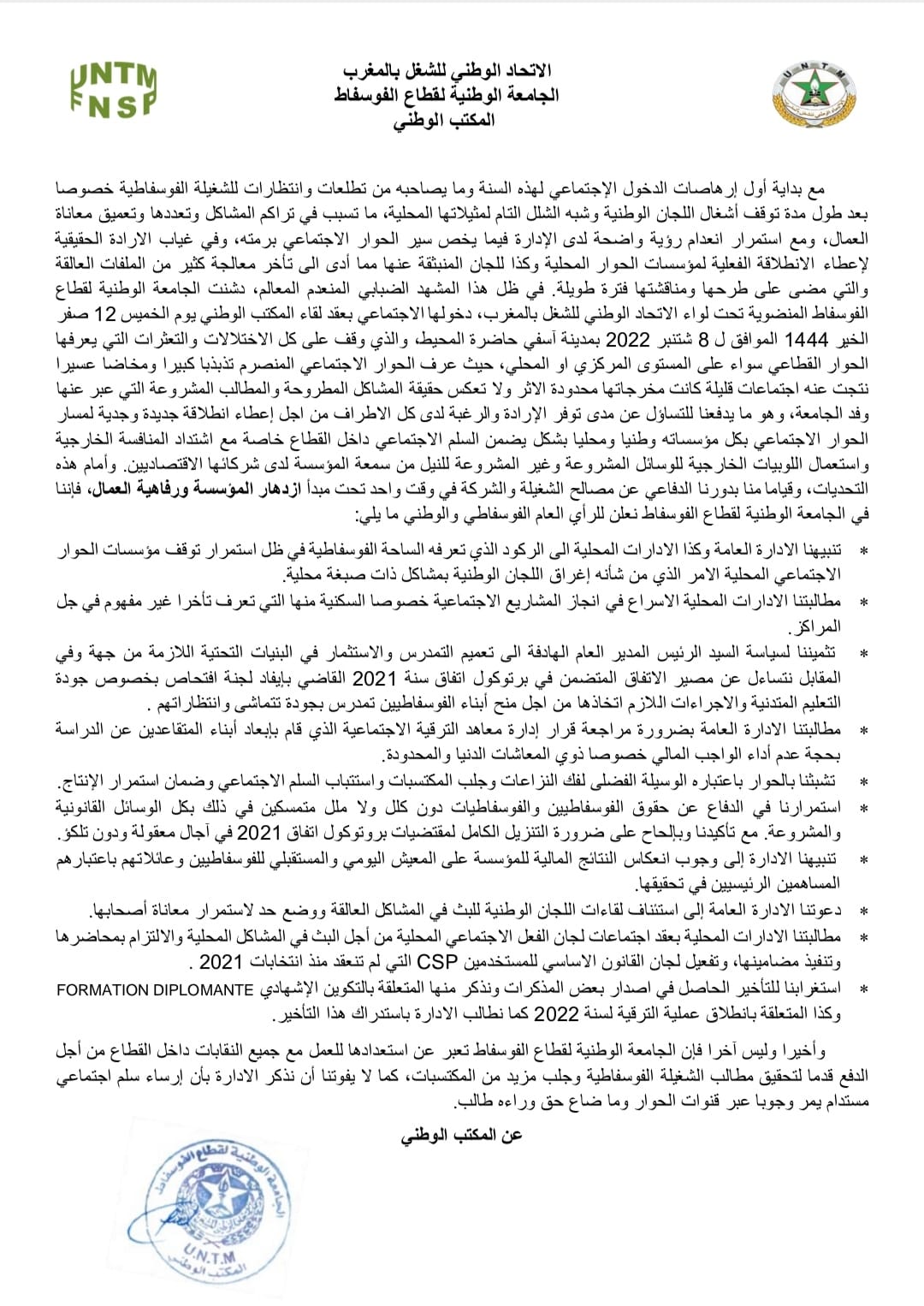 كما أكدت على استمرارها في الدفاع عن حقوق الفوسفاطيين والفوسفاطيات دون كلل ولا ملل متمسكين في ذلك بكل الوسائل القانونية والمشروعة. مع تأكيدنا وبإلحاح على ضرورة التنزيل الكامل لمقتضيات بروتوكول اتفاق 2021 في آجال معقولة ودون تلكؤ.