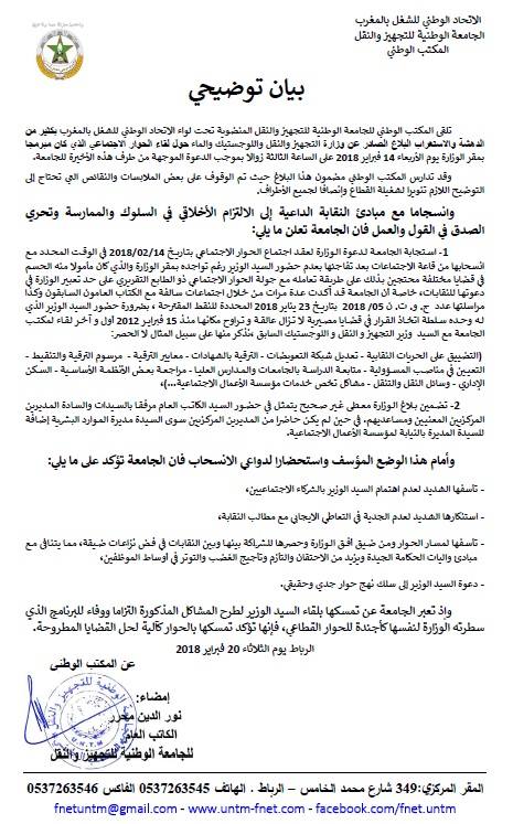 استنكر المكتب الوطني للجامعة الوطنية للتجهيز والنقل المنضوية تحت لواء الاتحاد الوطني للشغل بالمغرب، البلاغ الصادر عن وزارة التجهيز والنقل واللوجستيك والماء حول لقاء الحوار الاجتماعي الذي كان مبرمجا بمقر الوزارة الأربعاء 14 فبراير 2018 بموجب الدعوة الموجهة من طرف الوزارة للجامعة.