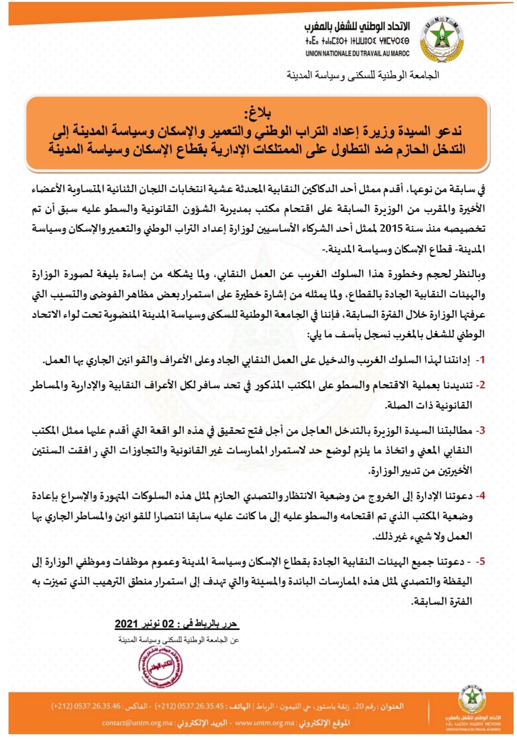 دعت الجامعة الوطنية للسكنى وسياسة المدينة، المنضوية تحت لواء الاتحاد الوطني للشغل بالمغرب، وزيرة إعداد التراب الوطني والتعمير والإسكان وسياسة المدينة إلى التدخل الحازم ضد التطاول على الممتلكات الإدارية بقطاع الإسكان وسياسة المدينة، على إثر اقتحام ممثل إحدى النقابات، لمكتب بمديرية الشؤون القانونية والسطو عليه سبق أن تم تخصيصه منذ سنة 2015 لممثل أحد الشركاء الأساسيين للوزارة.