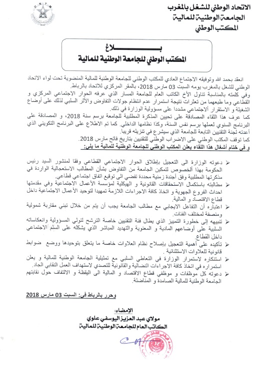وأعرب المكتب في بلاغ له عقب اجتماعه السبت 3 مارس 2018 بالمقر المركزي للاتحاد، عن استنكاره لاستمرار الوزارة في التعاطي السلبي مع تمثيلية الجامعة الوطنية للمالية، معلنا استمراره في اتخاذ كافة الإجراءات النضالية والقانونية للتصدي لاستهداف العمل النقابي الجاد.