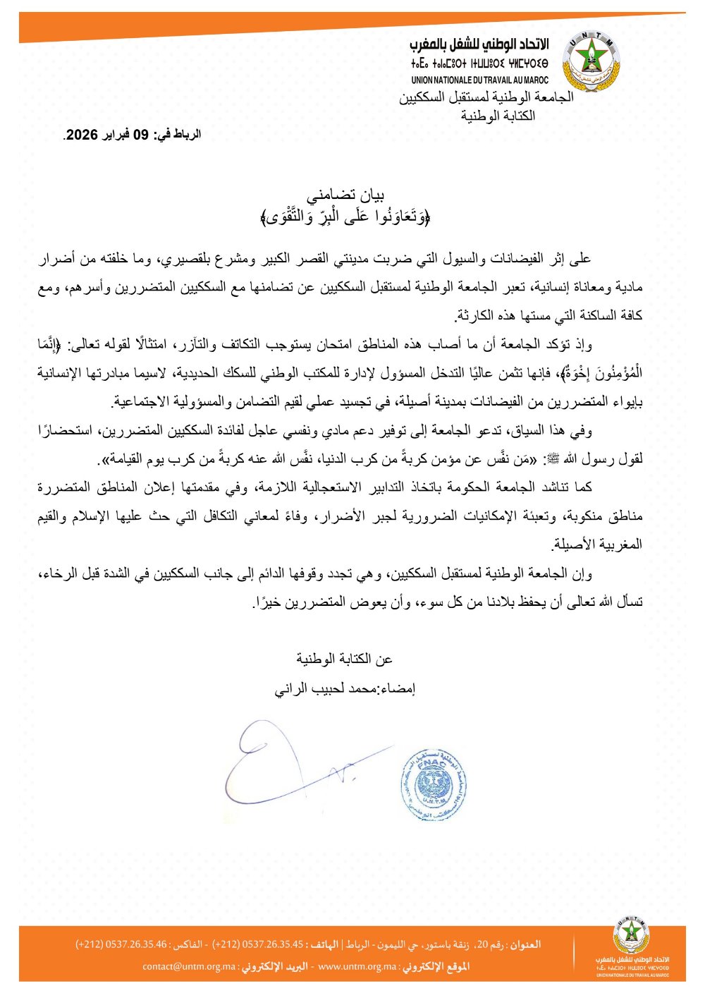 وأكدت الجامعة أن ما أصاب هذه المناطق امتحان يستوجب التكاتف والتآزر، امتثالًا لقوله تعالى: ﴿إِنَّمَا الْمُؤْمِنُونَ إِخْوَةٌ﴾، مثمنة عاليًا التدخل المسؤول لإدارة للمكتب الوطني للسكك الحديدية، لاسيما مبادرتها الإنسانية بإيواء المتضررين من الفيضانات بمدينة أصيلة، في تجسيد عملي لقيم التضامن والمسؤولية الاجتماعية.