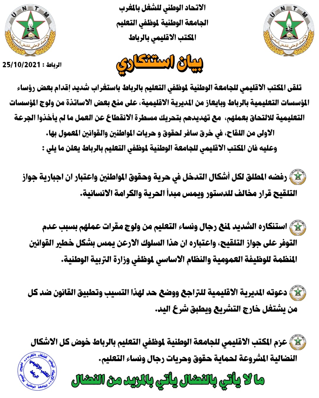 الجامعة الوطنية لموظفي التعليم بالرباط تستنكر منع بعض الاساتذة من ولوج المؤسسات التعليمية بسبب جواز التلقيح