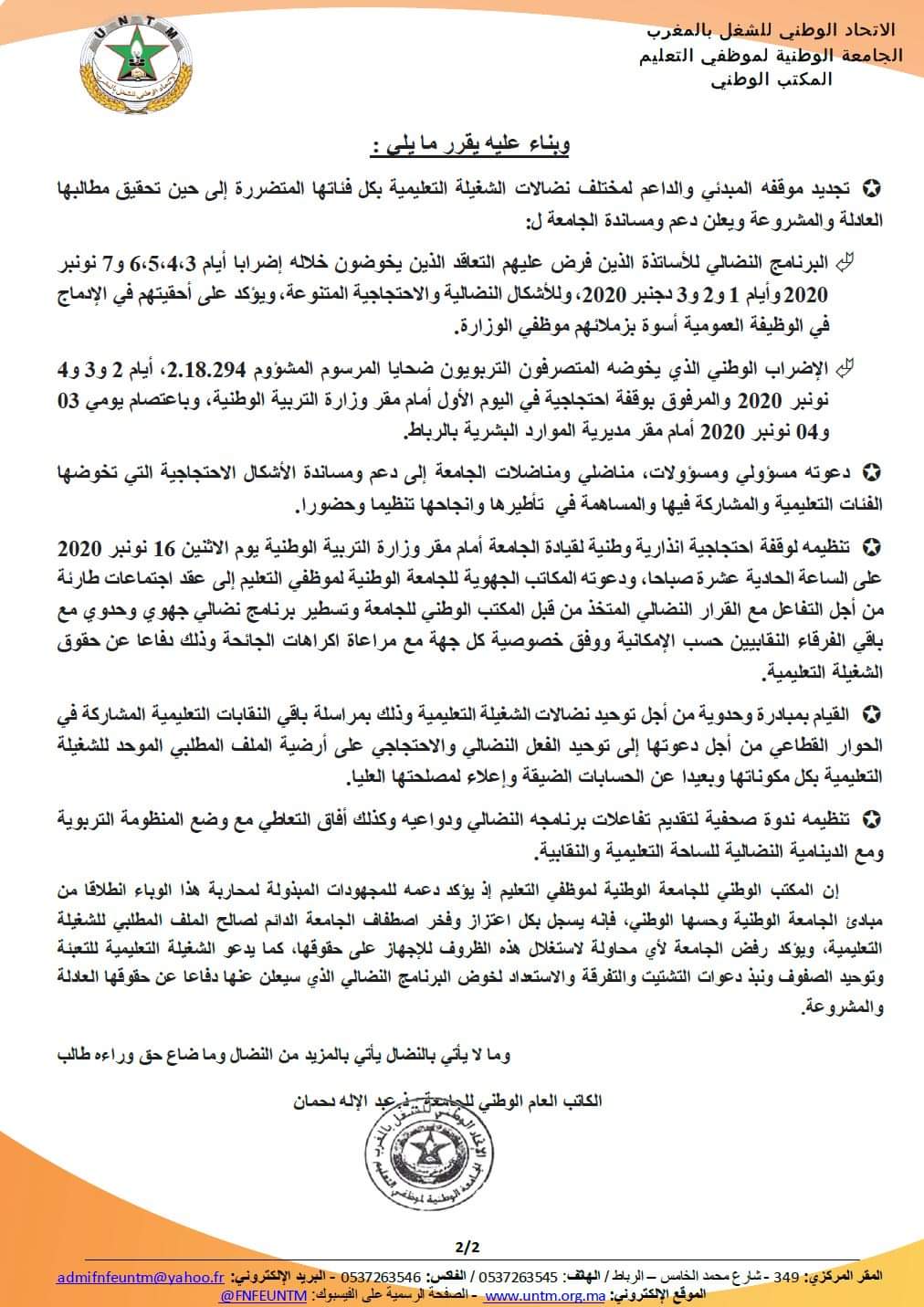 والإضراب الوطني الذي يخوضه المتصرفون التربويون ضحايا المرسوم المشؤوم 2.18.294، أيام 2 و3 و4 نونبر 2020 والمرفوق بوقفة احتجاجية في اليوم الأول أمام مقر وزارة التربية الوطنية، وباعتصام يومي 03 و04 نونبر 2020 أمام مقر مديرية الموارد البشرية بالرباط.