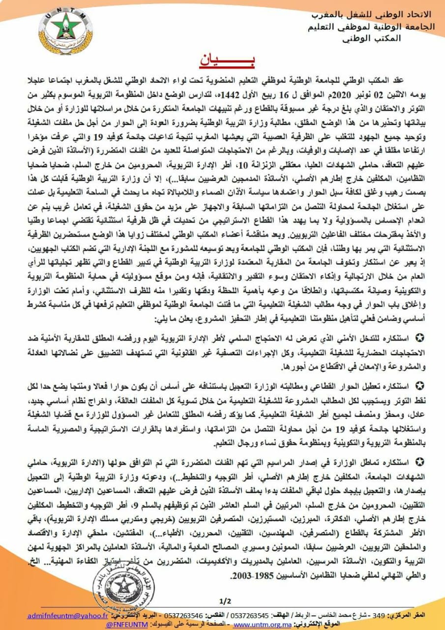 وسجلت الجامعة خلال اجتماع عاجل لمكتب الوطني الإثنين 2 نونبر 2020، استنكارها للتدخل الأمني الذي تعرض له الاحتجاج السلمي لأطر الإدارة التربوية الإثنين، مؤكدة رفضها المطلق للمقاربة الأمنية ضد الاحتجاجات الحضارية للشغيلة التعليمية، وكل الإجراءات التعسفية غير القانونية التي تستهدف التضييق على نضالاتها العادلة والمشروعة والإمعان في الاقتطاع من أجورها.