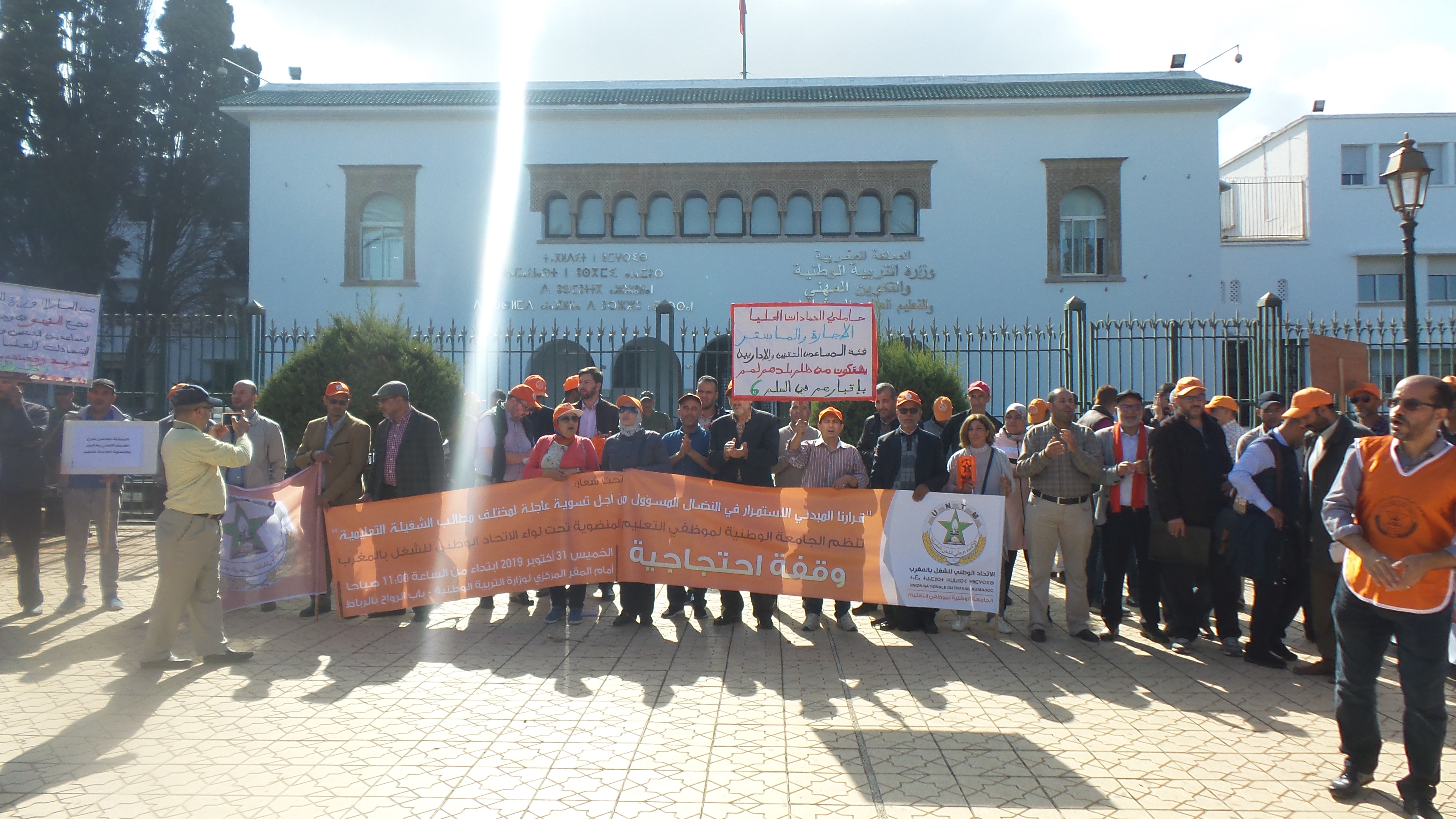 نظم مناضلو ومناضلات الجامعة الوطنية لموظفي التعليم المنضوية تحت لواء الاتحاد الوطني للشغل بالمغرب، الخميس 31 أكتوبر 2019 وقفة احتجاجية حاشدة أمام مقر وزارة التربية الوطنية بالرباط، احتجاجا على تماطل الوزارة في الاستجابة للمطالب المشروعة والعادلة للأسرة التعليمية.