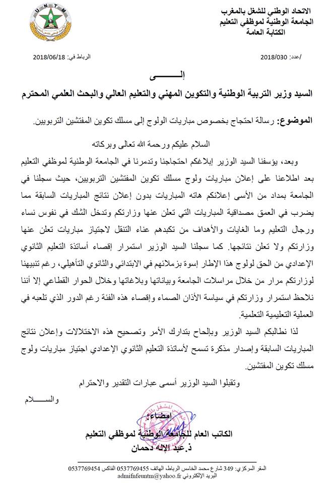 ودعت النقابة الوزارة إلى إصدار مذكرة تسمح لأساتذة التعليم الثانوي الإعدادي اجتياز مباريات ولوج مسلك تكوين المفتشين، مشددة على ضرورة تدارك الأمر وتصحيح هذه الاختلالات وإعلان نتائج المباريات السابقة.