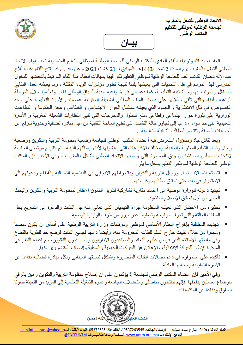 وجدد المكتب الوطني للجامعة، المطالبة بإخراج النظام الأساسي لموظفي وموظفات وزارة التربية الوطنية على أساس أن يكون منصفا ومحفزا من خلال تثبيت خارج السلم للفئات المحرومة منه، وأيضا دامجا لجميع الفئات لوضع حد للفئوية بالقطاع وفي مقدمتها الأساتذة الذين فرض عليهم التعاقد والمساعدون الإداريون والمساعدون التقنيون، مع إعادة النظر في المذكرة الإطار للحركة الانتقالية، والإعلان عن الحركات الجهوية والمحلية وإنصاف المتضررين منها.