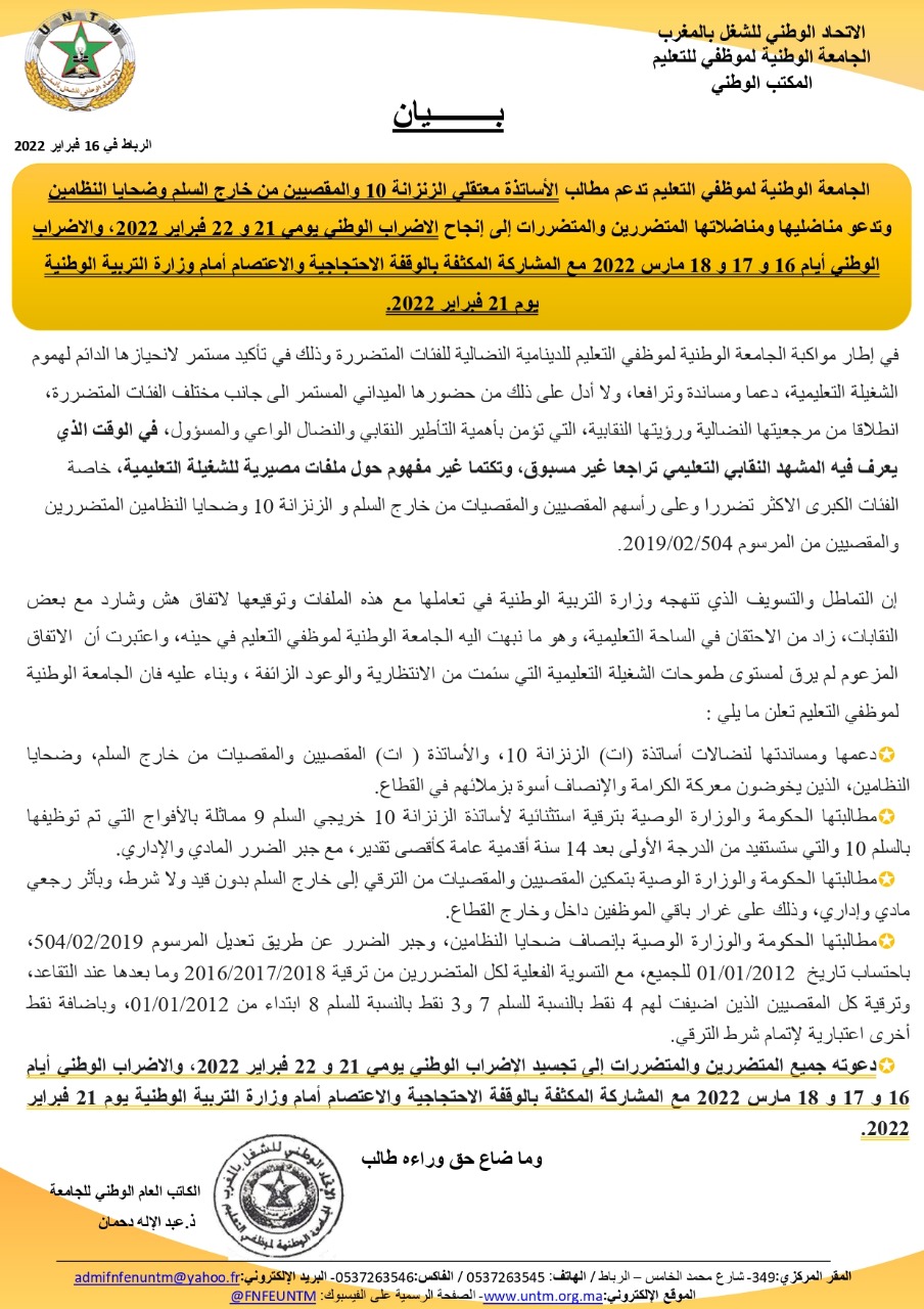 أكدت الجامعة الوطنية لموظفي التعليم، التابعة للاتحاد الوطني للشغل بالمغرب، دعمها لمطالب الأساتذة معتقلي الزنزانة 10 والمقصيين من خارج السلم وضحايا النظامين، داعية مناضليها ومناضلاتها المتضررين والمتضررات إلى إنجاح الاضراب الوطني يومي 21 و 22 فبراير 2022، والاضراب الوطني أيام 16 و 17 و 18 مارس 2022 مع المشاركة المكثفة بالوقفة الاحتجاجية والاعتصام أمام وزارة التربية الوطنية يوم 21 فبراير 2022.