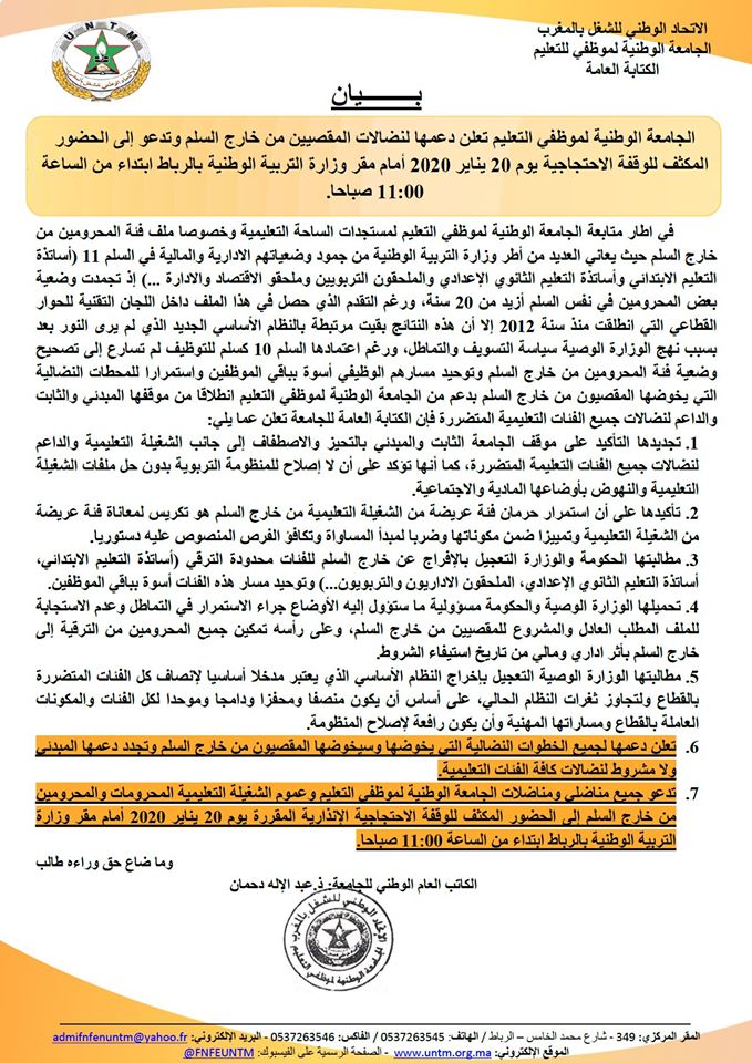 أعلنت الجامعة الوطنية لموظفي التعليم المنضوية تحت لواء الاتحاد الوطني للشغل بالمغرب، دعمها لنضالات المقصيين من خارج السلم، داعية إلى الحضور المكثف للوقفة الاحتجاجية يوم 20 يناير 2020 أمام مقر وزارة التربية الوطنية بالرباط.