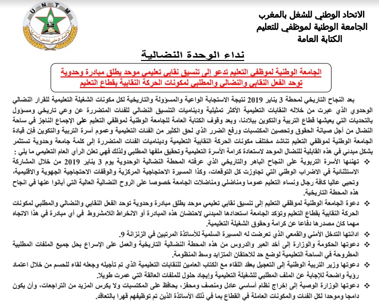 دعت الجامعة الوطنية لموظفي التعليم المنضوية تحت لواء الاتحاد الوطني للشغل بالمغرب إلى تنسيق نقابي تعليمي موحد يطلق مبادرة وحدوية توحد الفعل النقابي والنضالي والمطلبي لمكونات الحركة النقابية بقطاع التعليم، مؤكدة  استعدادها المبدئي لاحتضان هذه المبادرة أو الانخراط اللامشروط  في أي مبادرة في هذا الاتجاه مهما كان مصدرها دفاعا عن كرامة وحقوق الشغيلة التعليمية.