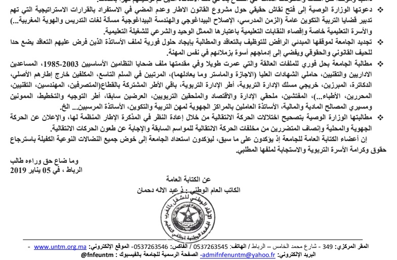 وطالبت الجامعة الوزارة الوصية بتصحيح اختلالات الحركة الانتقالية من خلال إعادة النظر في المذكرة الإطار المنظمة لها، والإعلان عن الحركة الجهوية والمحلية وإنصاف المتضررين من مخلفات الحركة الانتقالية للمواسم السابقة والإجابة عن طعون الحركات الانتقالية، مؤكدة استعدادها إلى خوض جميع النضالات النوعية الكفيلة باسترجاع حقوق وكرامة الأسرة التربوية والاستجابة لملفها المطلبي.