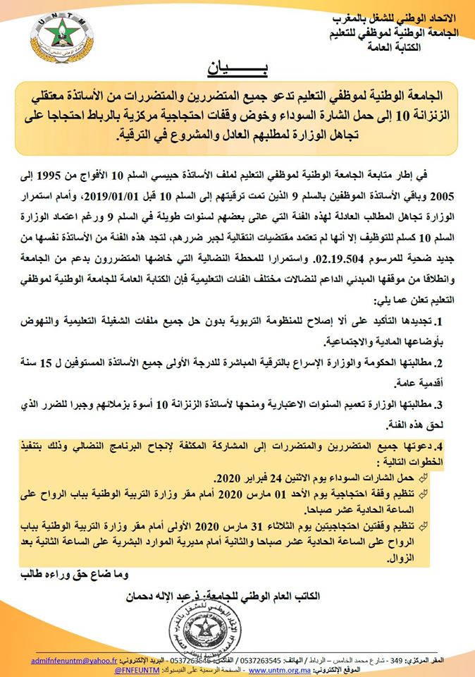 وطالبت الوزارة تعميم السنوات الاعتبارية ومنحها لأساتذة الزنزانة 10 أسوة بزملائهم وجبرا للضرر الذي لحق هذه الفئة، داعية جميع المتضررين والمتضررات إلى المشاركة المكثفة لإنجاح البرنامج النضالي الذي يتضمن حمل الشارات السوداء يوم الاثنين 24 فبراير 2020، وتنظيم وقفة احتجاجية يوم الأحد 01 مارس 2020 أمام مقر وزارة التربية الوطنية بباب الرواح على الساعة الحادية عشر صباحا، وتنظيم وقفتين احتجاجيتين يوم الثلاثاء 31 مارس 2020 الأولى أمام مقر وزارة التربية الوطنية بباب الرواح على الساعة الحادية عشر صباحا والثانية أمام مديرية الموارد البشرية على الساعة الثانية بعد الزوال.