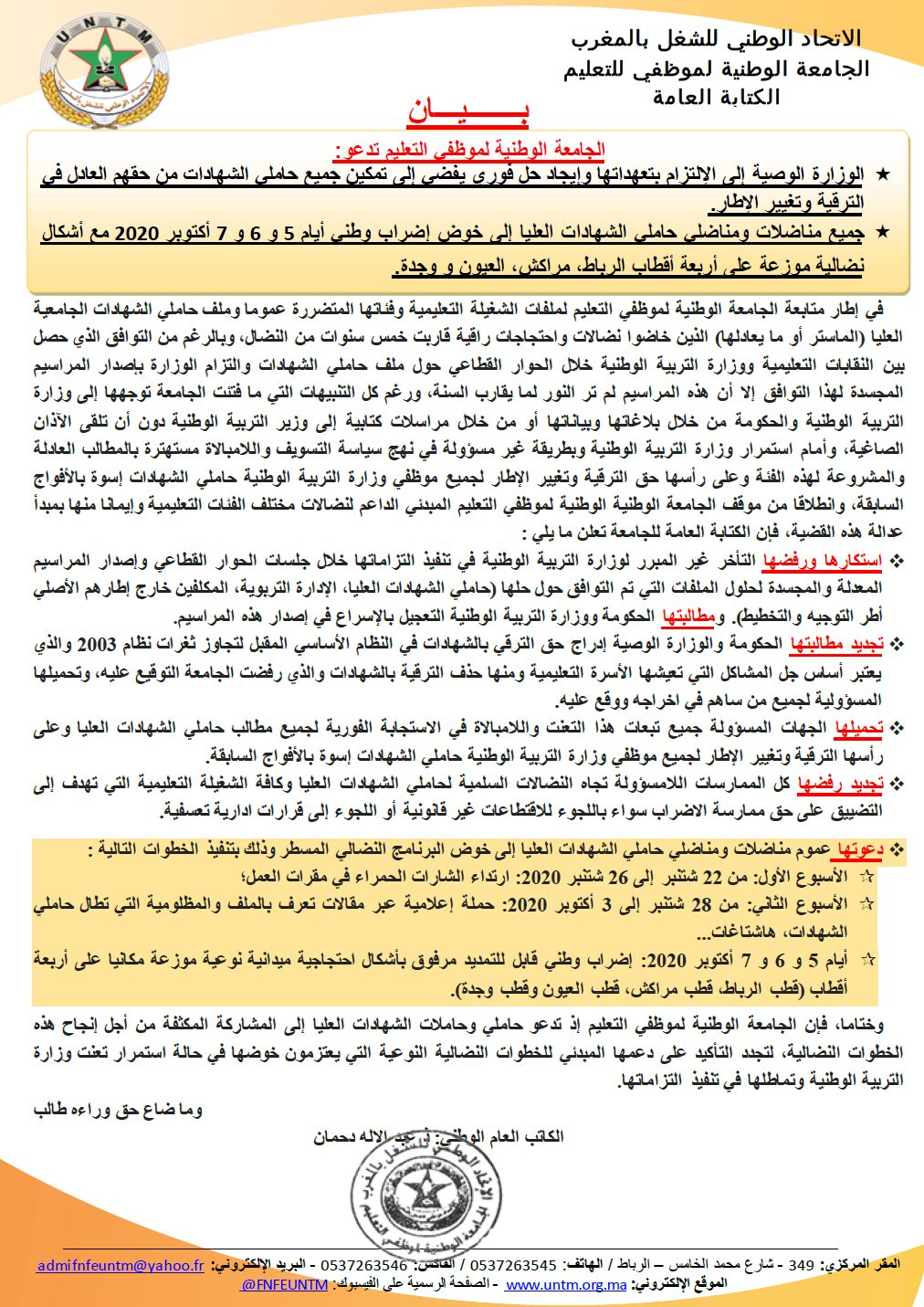 دعت الجامعة الوطنية لموظفي التعليم، المنضوية تحت لواء الاتحاد الوطني للشغل بالمغرب، الوزارة الوصية إلى الإلتزام بتعهداتها وإيجاد حل فوري يفضي إلى تمكين جميع حاملي الشهادات من حقهم العادل في الترقية وتغيير الإطار، مطالبة جميع مناضلات ومناضلي حاملي الشهادات العليا إلى خوض إضراب وطني أيام 5 و 6 و 7 أكتوبر 2020 مع أشكال نضالية موزعة على أربعة أقطاب الرباط، مراكش، العيون و وجدة.