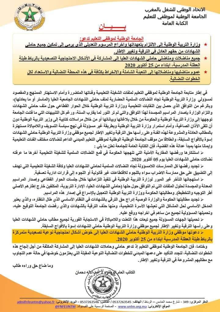 دعت الجامعة الوطنية لموظفي التعليم، المنضوية تحت لواء الاتحاد الوطني للشغل بالمغرب، وزارة التربية الوطنية إلى الالتزام بتعهداتها واخراج المرسوم التعديلي الذي يرمي إلى تمكين جميع حاملي الشهادات من حقهم العادل في الترقية وتغيير الإطار، وطالبت الجامعة جميع مناضلات ومناضلي حاملي الشهادات العليا إلى المشاركة في الأشكال الاحتجاجية التصعيدية بالرباط طيلة العطلة المدرسية، ابتداء من 25 أكتوبر 2020.