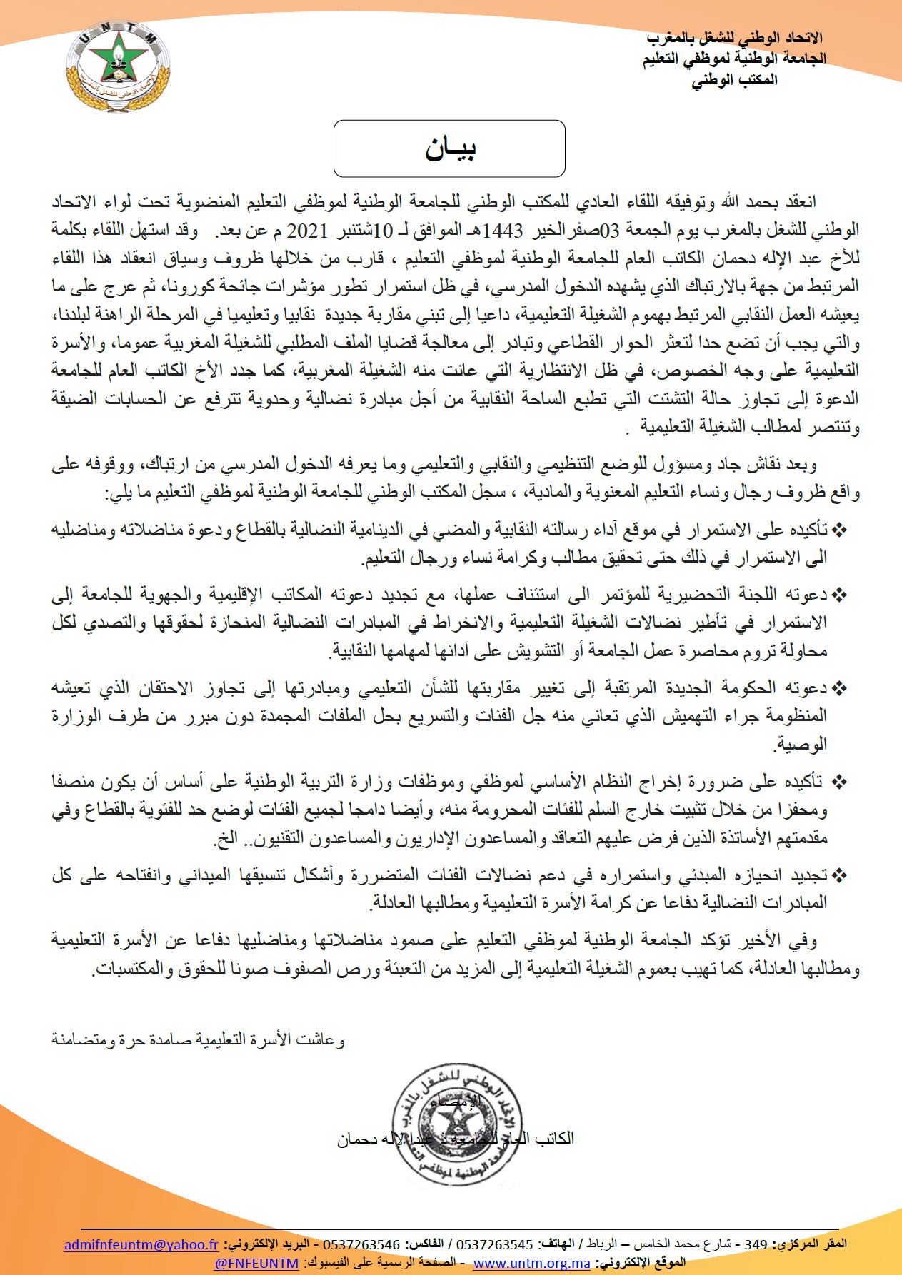 الجامعة الوطنية لموظفي التعليم تدعو الحكومة المرتقبة إلى تغيير المقاربة للشأن التعليمي والمبادرة إلى تجاوز الاحتقان