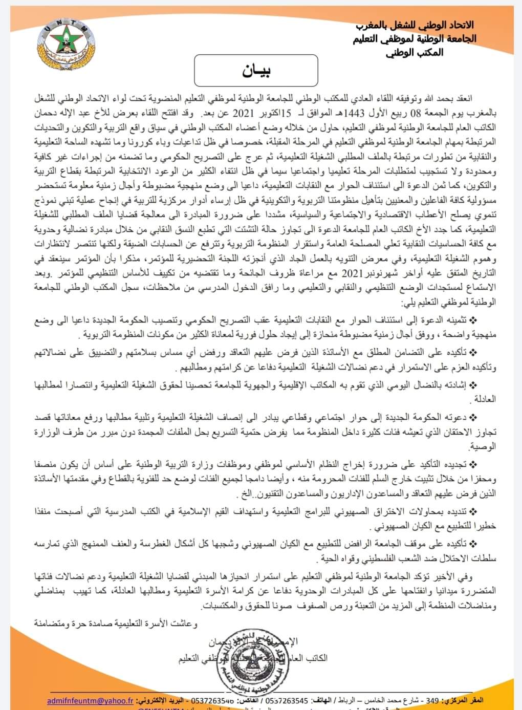 وأكدت الجامعة، خلال انعقاد مكتبها الوطني عن بعد، يوم الجمعة 08 ربيع الأول 1443هـ الموافق لـ 15اكتوبر 2021، على التضامن المطلق مع الأساتذة الذين فرض عليهم التعاقد ورفض أي مساس بسلامتهم والتضييق على نضالاتهم وتأكيده العزم على الاستمرار في دعم نضالات الشغيلة التعليمية دفاعا عن كرامتهم ومطالبهم .