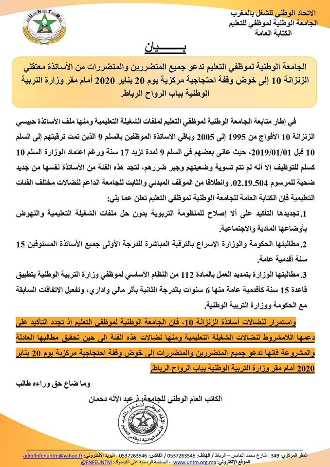 دعت الجامعة الوطنية لموظفي التعليم المنضوية تحت لواء الاتحاد الوطني للشغل بالمغرب جميع المتضررين والمتضررات من الأساتذة معتقلي الزنزانة 10 إلى خوض وقفة احتجاجية مركزية يوم 20 يناير 2020 أمام مقر وزارة التربية الوطنية بباب الرواح الرباط، احتجاجا على عدم تسوية وضعيتهم وجبر ضررهم.