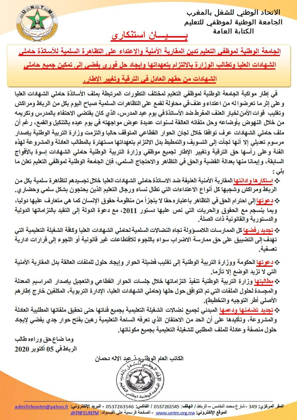 أدانت الجامعة الوطنية لموظفي التعليم، المنضوية تحت لواء الاتحاد الوطني للشغل بالمغرب، المقاربة الأمنية والإعتداء على التظاهرة السلمية للأساتذة حاملي الشهادات العليا، يوم الإثنين 5 أكتوبر 2020، بكل من الرباط ومراكش ، واستنكرت تغليب قوات الأمن لخيار العنف المفرط ضد الأساتذة في يوم عيد المدرس، مطالبة الوزارة بالالتزام بتعهداتها وإيجاد حل فوري يفضي إلى تمكين جميع حاملي الشهادات من حقهم العادل في الترقية وتغيير الإطار.