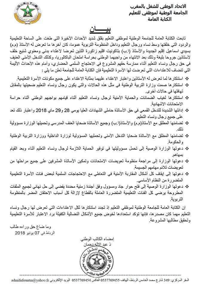 استنكرت الجامعة الوطنية لموظفي التعليم، المنضوية تحت لواء الاتحاد الوطني للشغل بالمغرب، الاعتداءات المتكررة التي تعرض لها عدد من الأساتذة، وكان آخرها ما تعرض له الأستاذ (م.م) بسيدي اسماعيل إقليم الجديدة والأستاذ (ا.ب) بتاكونيت اقليم زاكورة اللذين تعرضا لاعتداء بدني ومعنوي خلف جروحا بليغة، وذلك بعد الانتهاء من واجبهما الوطني بحراسة امتحان الباكالوريا، معلنة تضامنها المطلق مع الأستاذين وجميع الأساتذة ضحايا العنف المدرسي وتحميلها الوزارة مسؤولية ذلك.