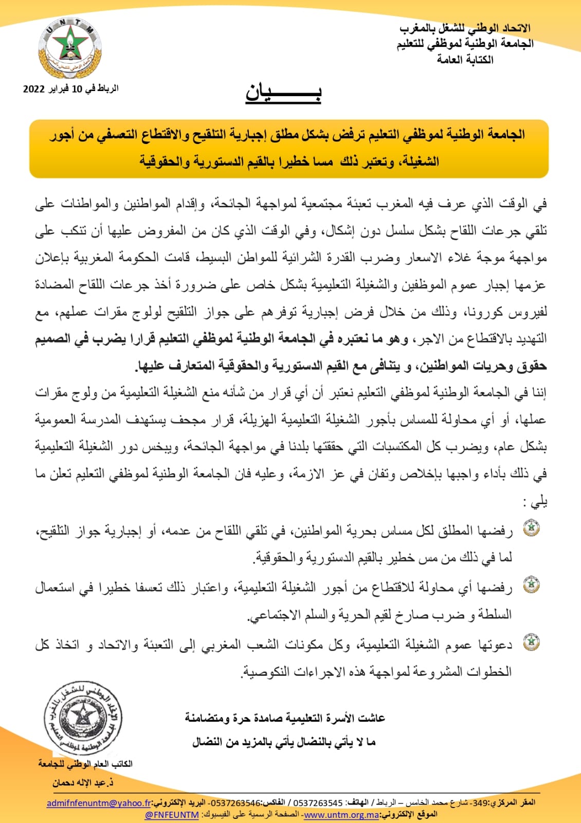 أكدت الجامعة الوطنية لموظفي التعليم، التابعة للاتحاد الوطني للشغل بالمغرب، رفضها المطلق لكل مساس بحرية المواطنين، في تلقي اللقاح من عدمه، أو إجبارية جواز التلقيح، لما في ذلك من مس خطير بالقيم الدستورية والحقوقية.