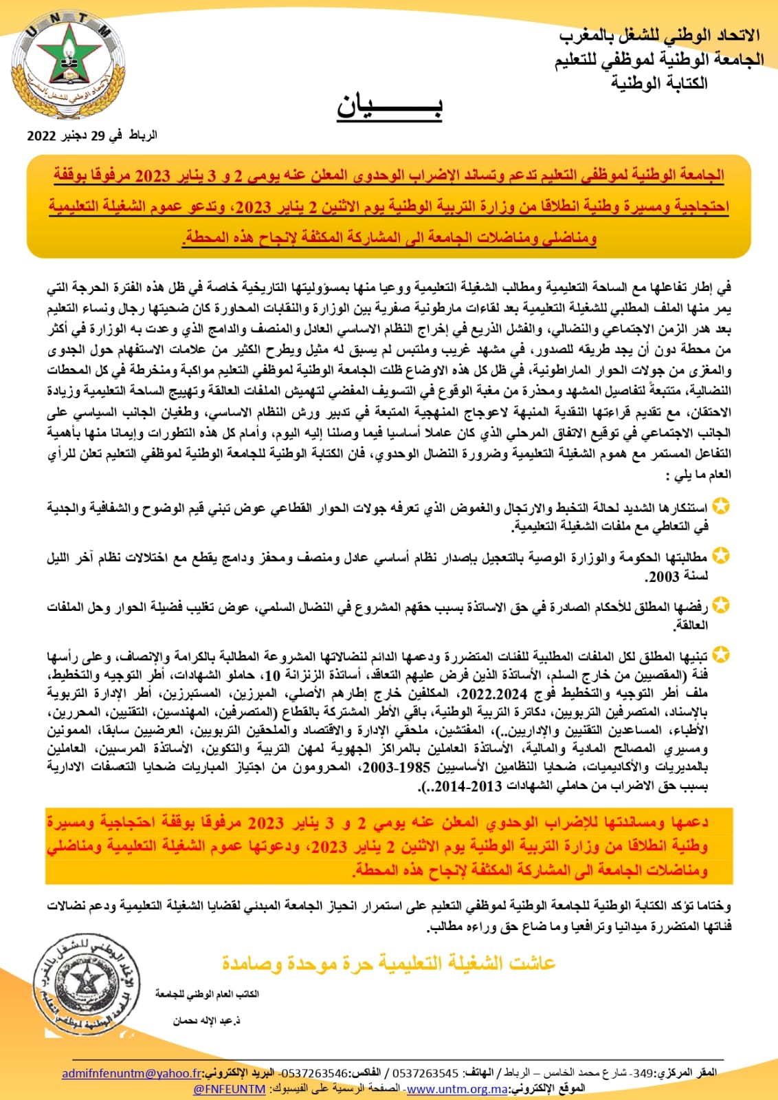وأكدت دعمها ومساندتها للإضراب الوحدوي المعلن عنه يومي 2 و 3 يناير 2023 مرفوقا بوقفة احتجاجية ومسيرة وطنية انطلاقا من وزارة التربية الوطنية يوم الاثنين 2 يناير 2023، داعية عموم الشغيلة التعليمية ومناضلي ومناضلات الجامعة الى المشاركة المكثفة لإنجاح هذه المحطة.