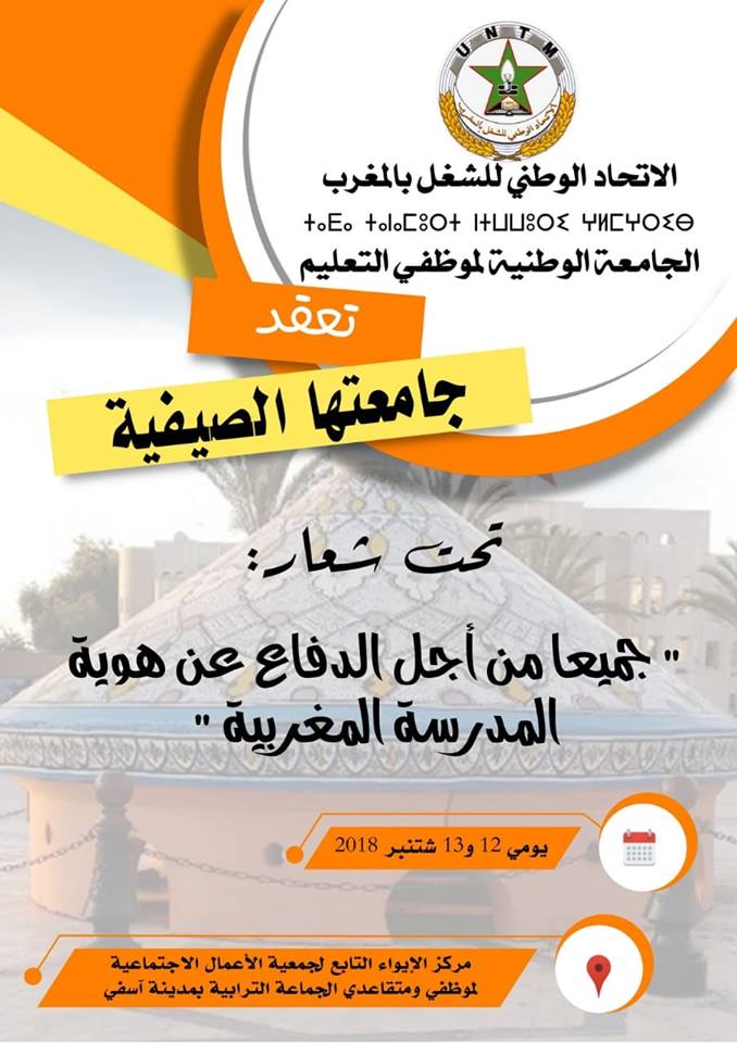تعقد الجامعة الوطنية لموظفي التعليم المنضوية تحت لواء الاتحاد الوطني للشغل بالمغرب، يومي 12 و13 شتنبر 2018، بمدينة آسفي جامعتها الصيفية تحت شعار ” جميعا من أجل الدفاع عن هوية المدرسة المغربية”.
