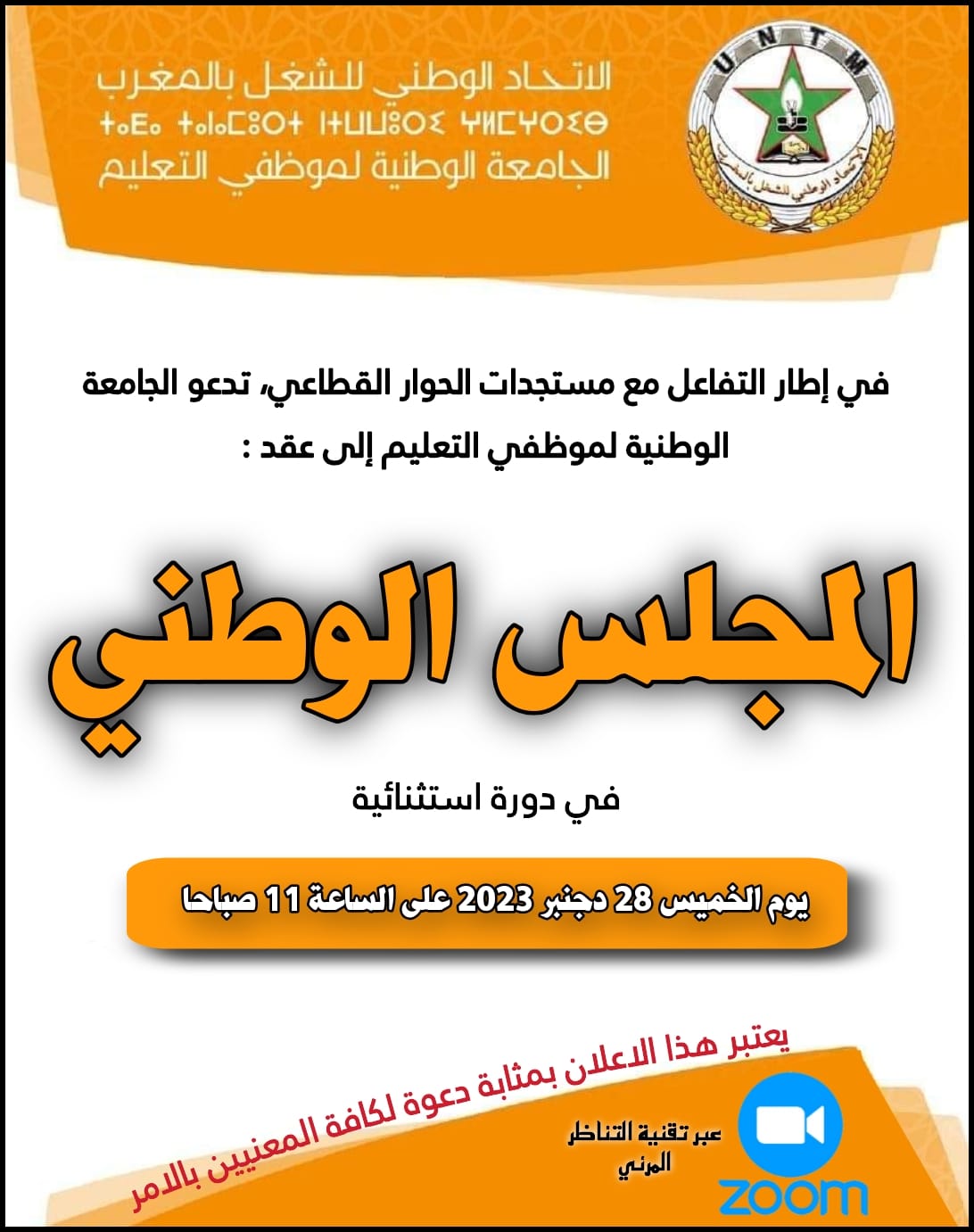في إطار التفاعل مع مستجدات الحوار القطاعي، تعقد الجامعة الوطنية لموظفي التعليم، المنضوية تحت لواء الاتحاد الوطني للشغل بالمغرب،دورة استثنائية لمجلسها الوطني، الخميس 28 دجنبر 2023، على الساعة الحادية عشرة.