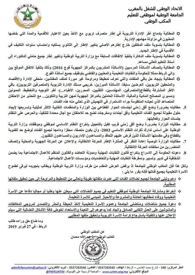 أعلنت الجامعة الوطنية لموظفي التعليم المنضوية تحت لواء الاتحاد الوطني للشغل بالمغرب، رفضها لعرض وزارة التربية الوطنية المقدم خلال اللقاء الذي يبقى عرضا لا يرقى لطموح جميع الفئات التعلمية رغم تقدمه الطفيف والمحدود وغير الشامل لعموم الفئات وقضايا الأسرة التعليمية عامة وعلى الخصوص الأساتذة الذين فرض عليهم التعاقد والمقصيين من خارج السلم وفئة المفتشين
