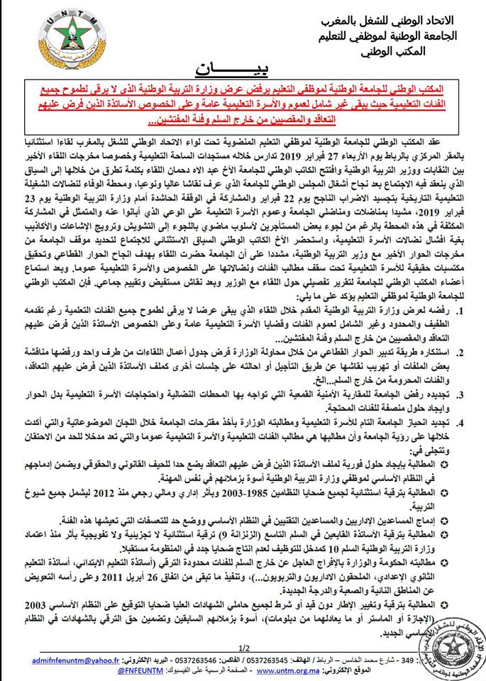 وسجلت الجامعة في بلاغ لها، خلال انعقاد مكتبها الوطني يوم الأربعاء 27 فبراير 2019،