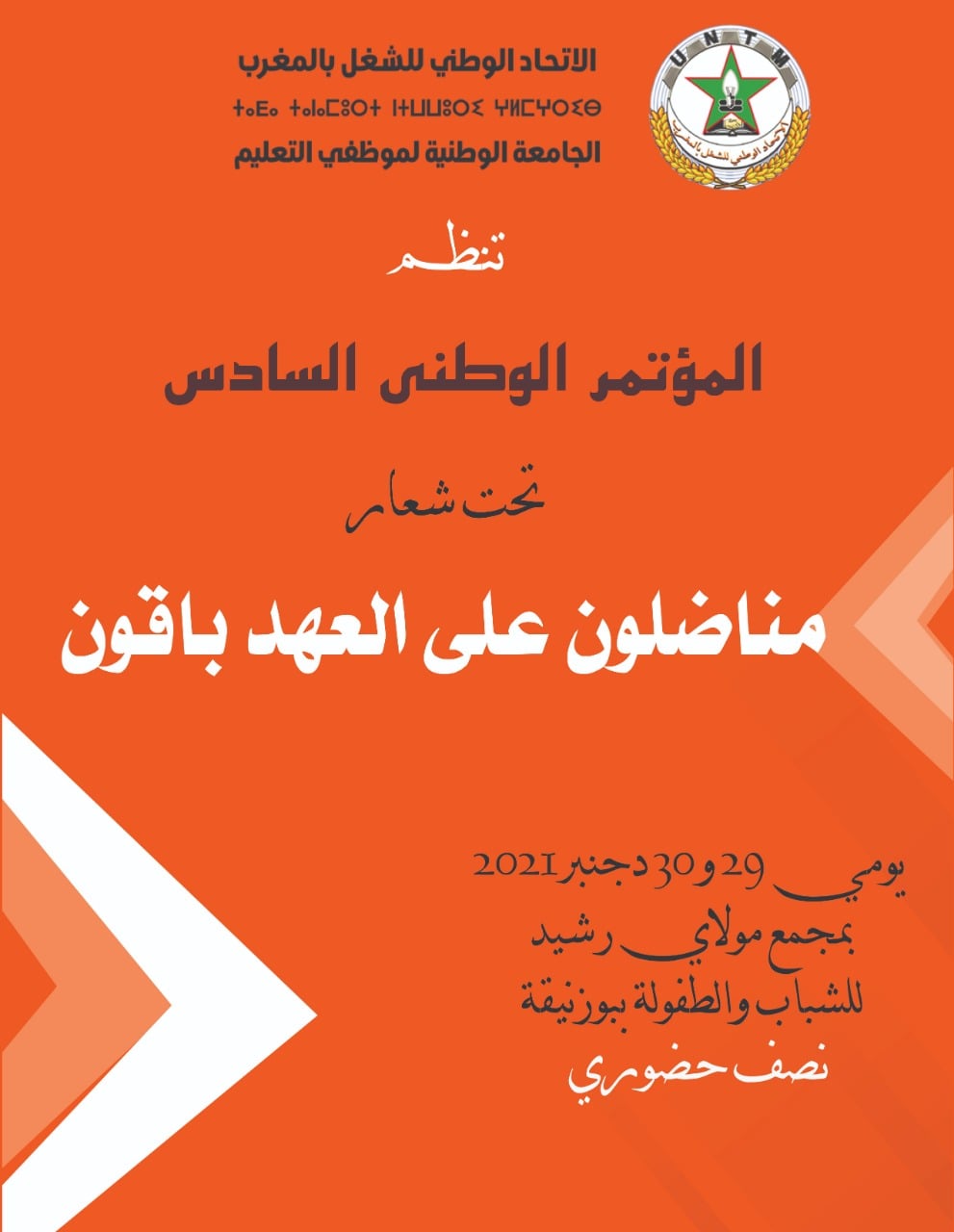 تنظم الجامعة الوطنية لموظفي التعليم المنضوية تحت لواء الاتحاد الوطني للشغل بالمغرب، يومي 30/29 دجنبر 2021، مؤتمرها الوطني السادس بمجمع مولاي رشيد للشباب والطفولة ببوزنيقة، وذلك تحت شعار “مناضلون على العهد باقون”.