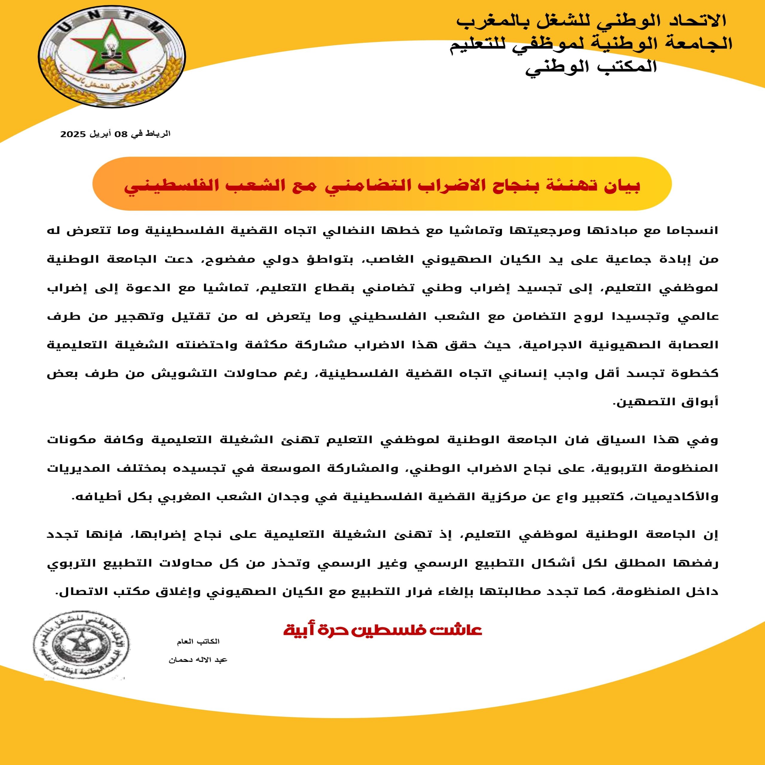 أكدت الجامعة الوطنية لموظفي التعليم، أن الإضراب الوطني التضامني بقطاع التعليم، الذي دعت إليه تماشيا مع الدعوة إلى إضراب عالمي وتجسيدا لروح التضامن مع الشعب الفلسطيني وما يتعرض له من تقتيل وتهجير من طرف العصابة الصهيونية الاجرامية، حقق مشاركة مكثفة واحتضنته الشغيلة التعليمية كخطوة تجسد أقل واجب إنساني اتجاه القضية الفلسطينية، رغم محاولات التشويش من طرف بعض أبواق التصهين.